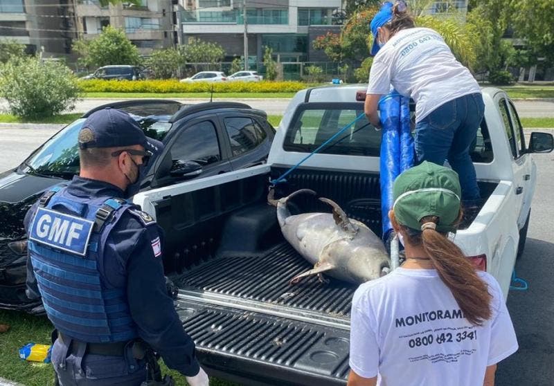 A corporação recebeu o relato de que o animal estaria encalhado e acionou uma equipe do Projeto de Monitoramento de Praias da Bacia de Santos, que constatou a morte do golfinho, segundo a Guarda.