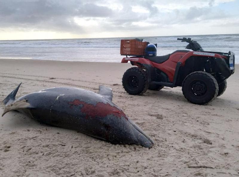 O animal foi encontrado pelas equipes de monitoramento de praias da R3 Animal. O corpo do golfinho foi levado para o Centro de Pesquisa, Reabilitação e Despetrolização de Animais Marinhos (Cepram/R3 Animal).