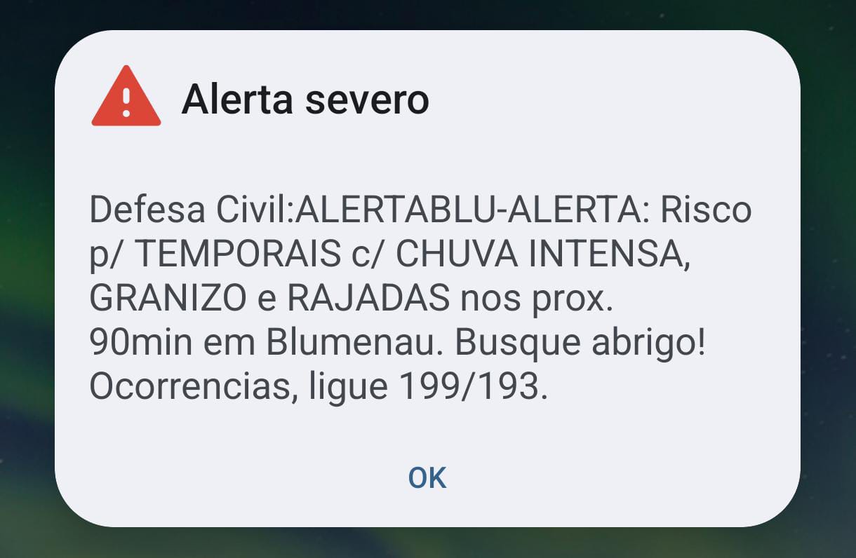 O tempo fechou na tarde desta quinta-feira (8) em Blumenau provocando até um alerta da Defesa Civil pelo novo sistema Cell Broadcast — que emite sons nos celulares de moradores mesmo sem que estejam conectados à internet. Há registros de chuva de granizo na região da Itoupava Central que, segundo o AlertaBlu, foi a região que teve o maior volume de chuva até por volta das 16h, com 39,6 milímetros.