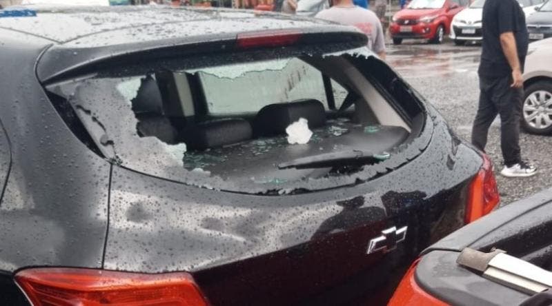Uma das ocorrências registradas foi a queda de uma árvore na Rua Aubé, no Boa Vista. Carros também foram atingidos pelo granizo. Em um dos casos (foto acima), registrado no bairro Glória, o vidro traseiro foi completamente destruído ao ser atingido por uma pedra de gelo.