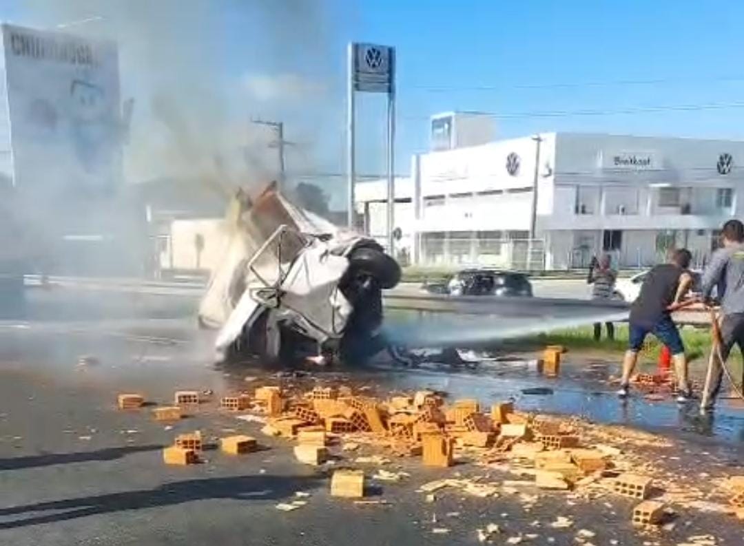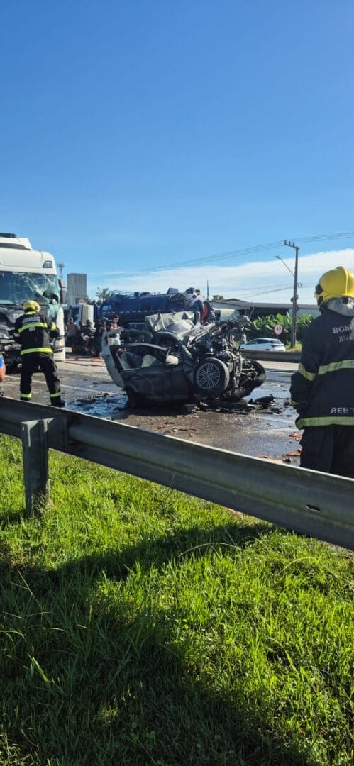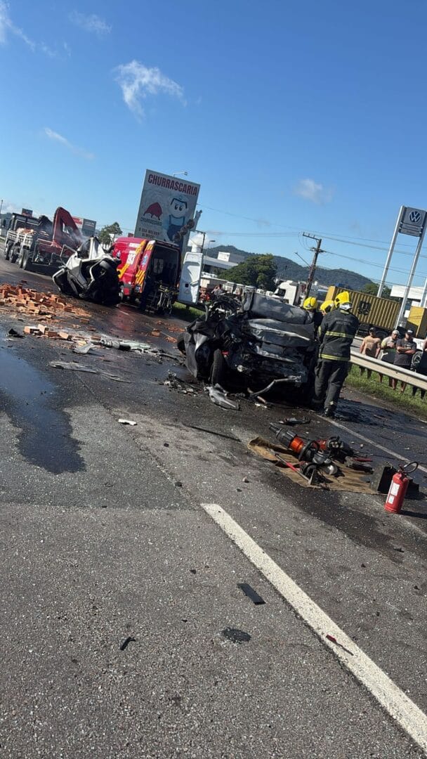 Os bombeiros militares foram acionados por volta das 8h30min e seguiram para o Km 115 da rodovia, em sentido Sul, ao Litoral. A Kombi pegou fogo e o incêndio foi combatido por populares. Um dos caminhões carregava tijolos, que ficaram espalhados pela BR.
