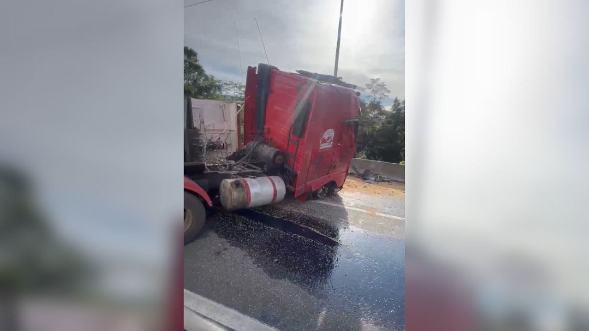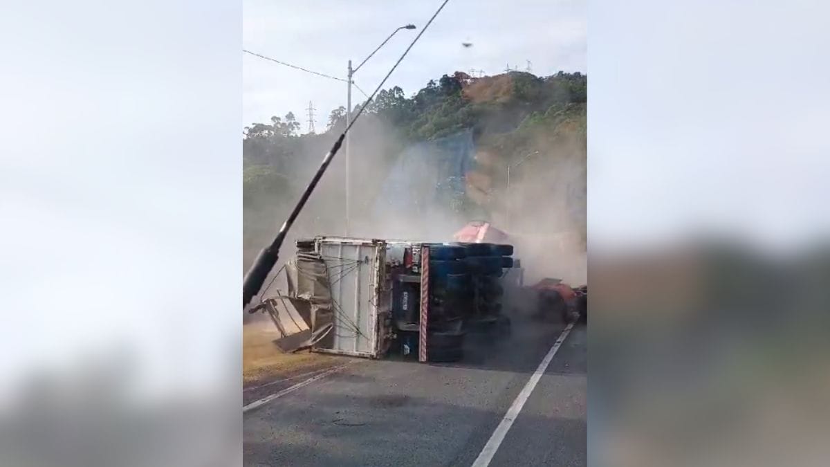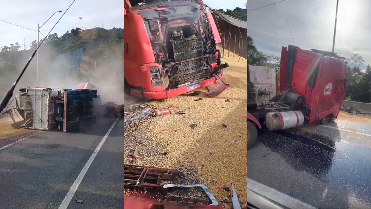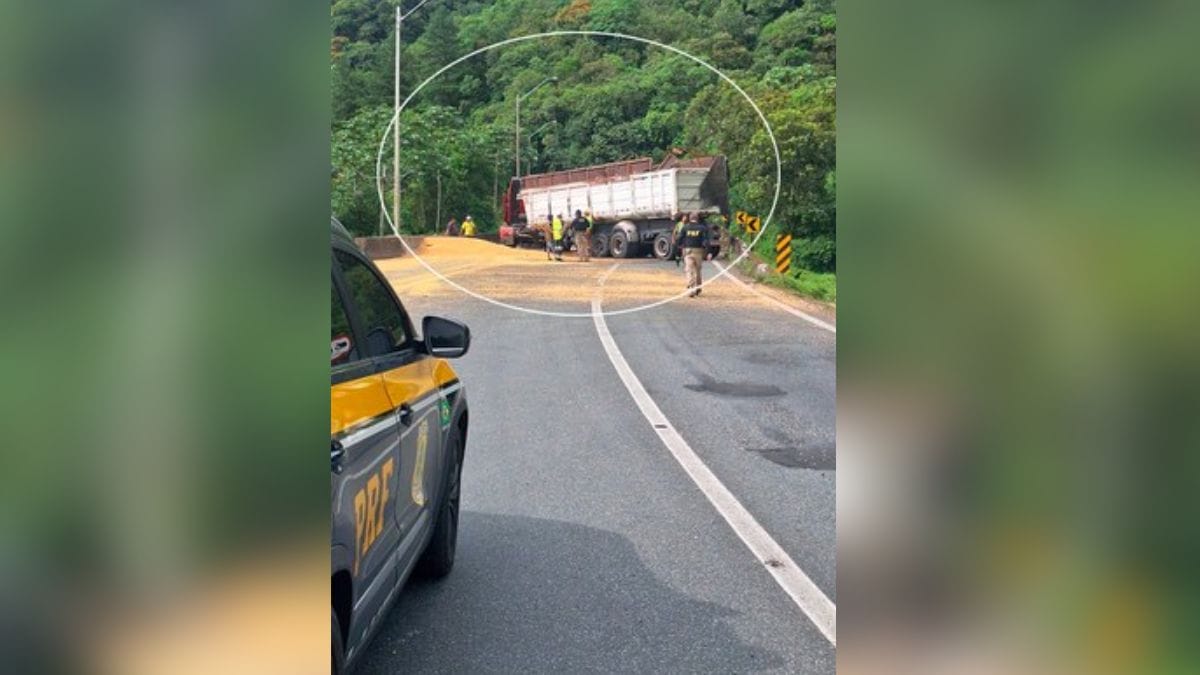 A carreta estava carregada com soja e tombou sozinha enquanto seguia no sentido Santa Catarina, no Km 665 da rodovia, em Guaratuba (PR). O trecho é o mesmo onde aconteceu o acidente, em setembro de 2024, que matou nove pessoas de uma equipe de remo de Pelotas (RS).