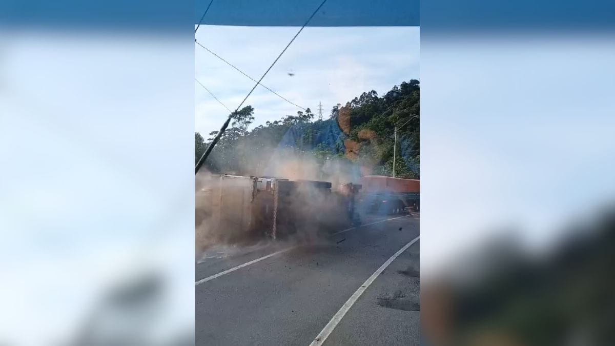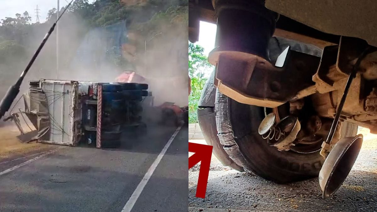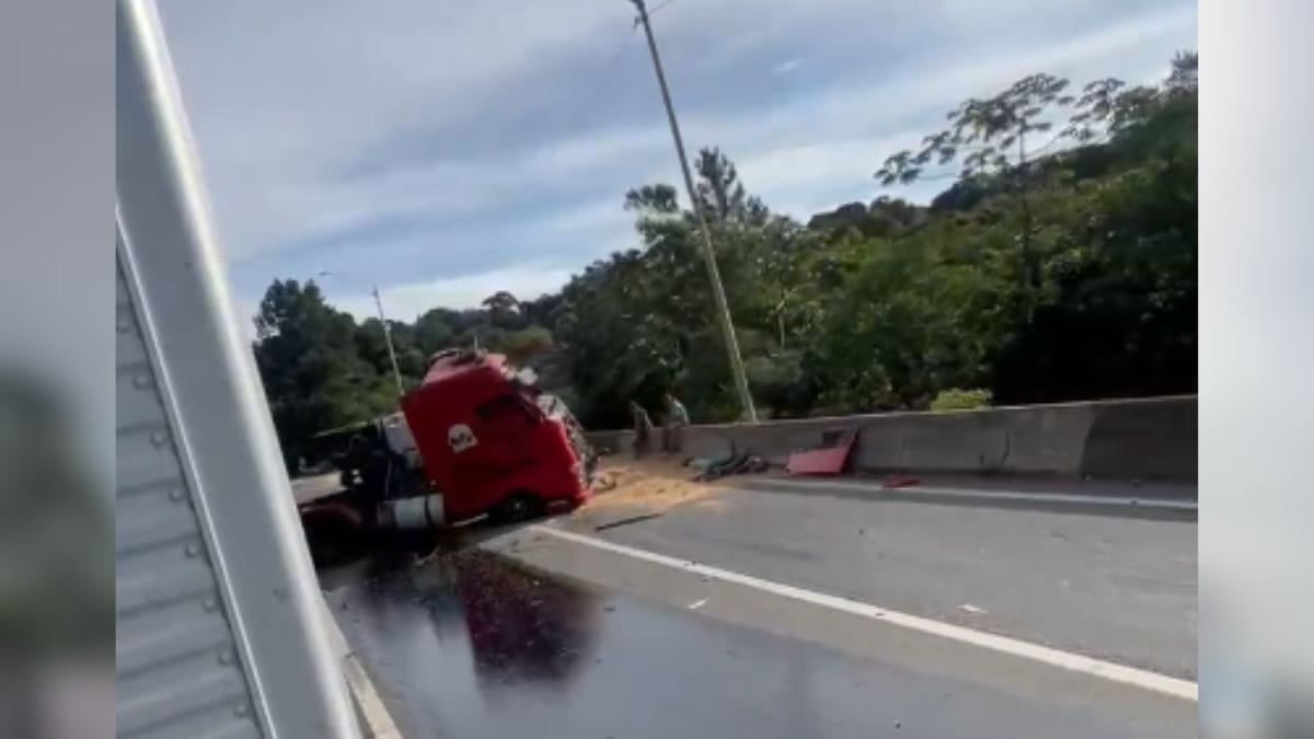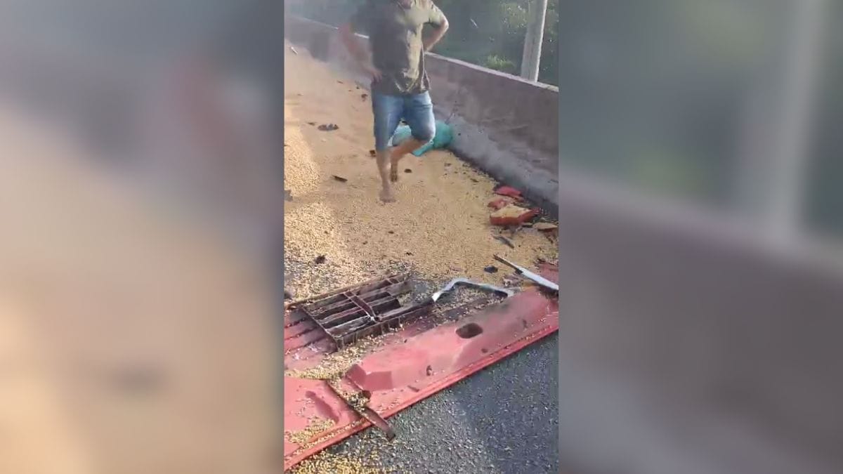 A carreta estava carregada com soja e tombou sozinha enquanto seguia no sentido Santa Catarina, no Km 665 da rodovia, em Guaratuba (PR). O trecho é o mesmo onde aconteceu o acidente, em setembro de 2024, que matou nove pessoas de uma equipe de remo de Pelotas (RS).