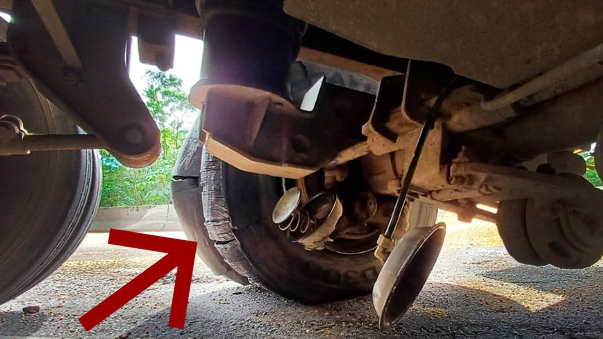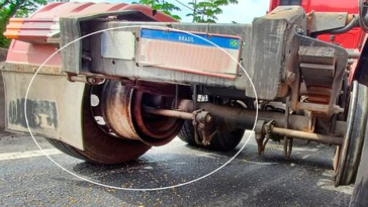 A carreta também apresentava pneus completamente desgastados. Além disso, foi identificado o uso não autorizado do dispositivo conhecido como “fominha”, uma modificação para que o veículo consiga transportar mais carga, aumentando o risco envolvido.