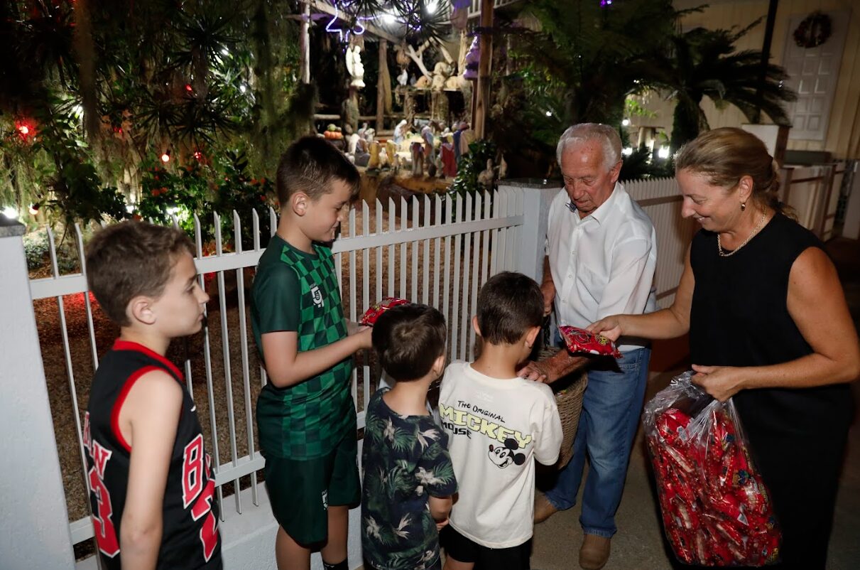Quem para na frente da cerca para contemplar o presépio é sempre abordado pelo morador, que chega segurando um cesto abarrotado de doces. Não importa a idade, ninguém sai dali de mãos vazias. Pipoca e bala são itens garantidos pelo anfitrião, que espera cada visitante sentado perto do portão diariamente, normalmente a partir das 19h. As luzes se apagam no fim da noite, entre 22h e 23h.