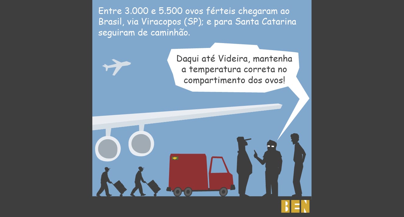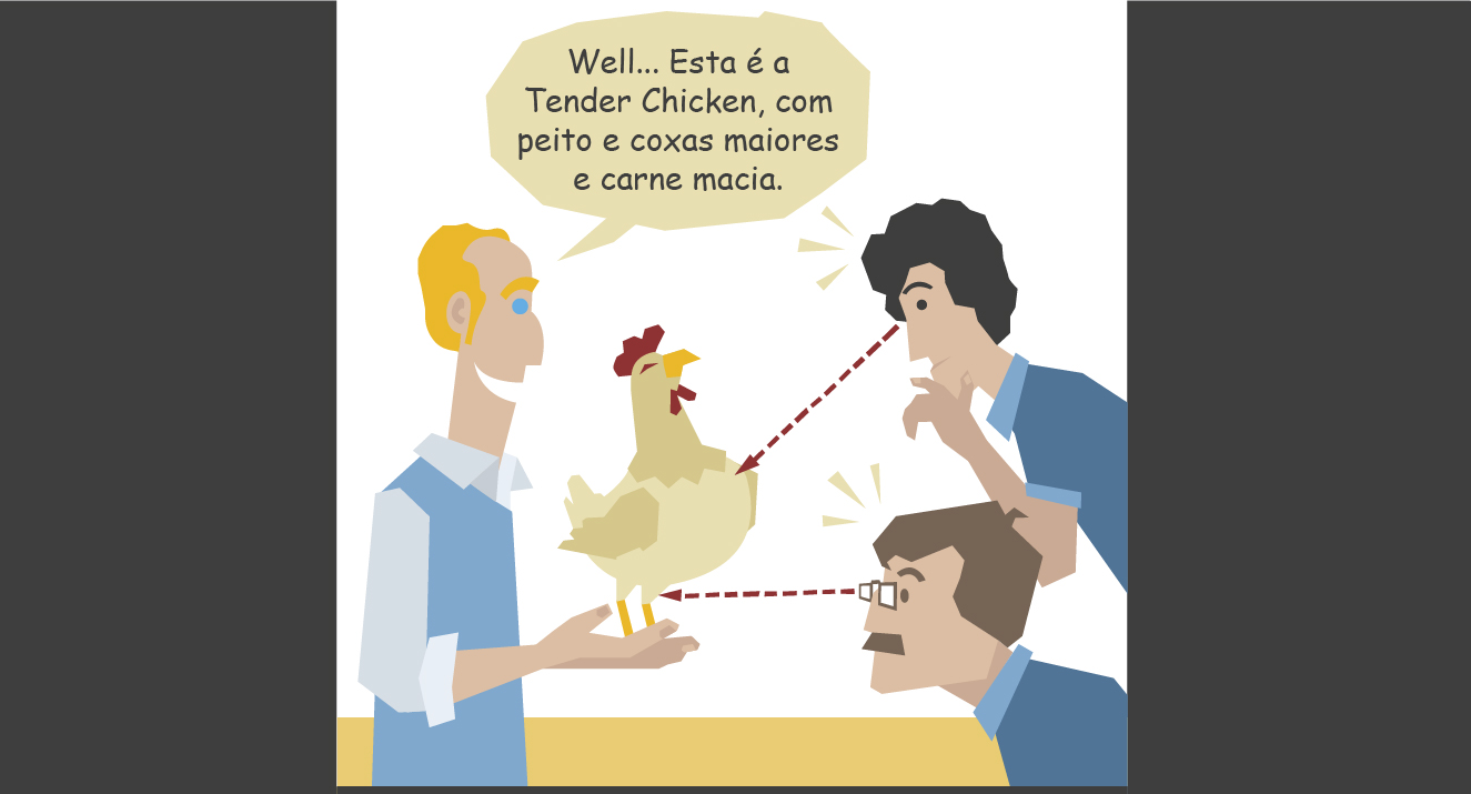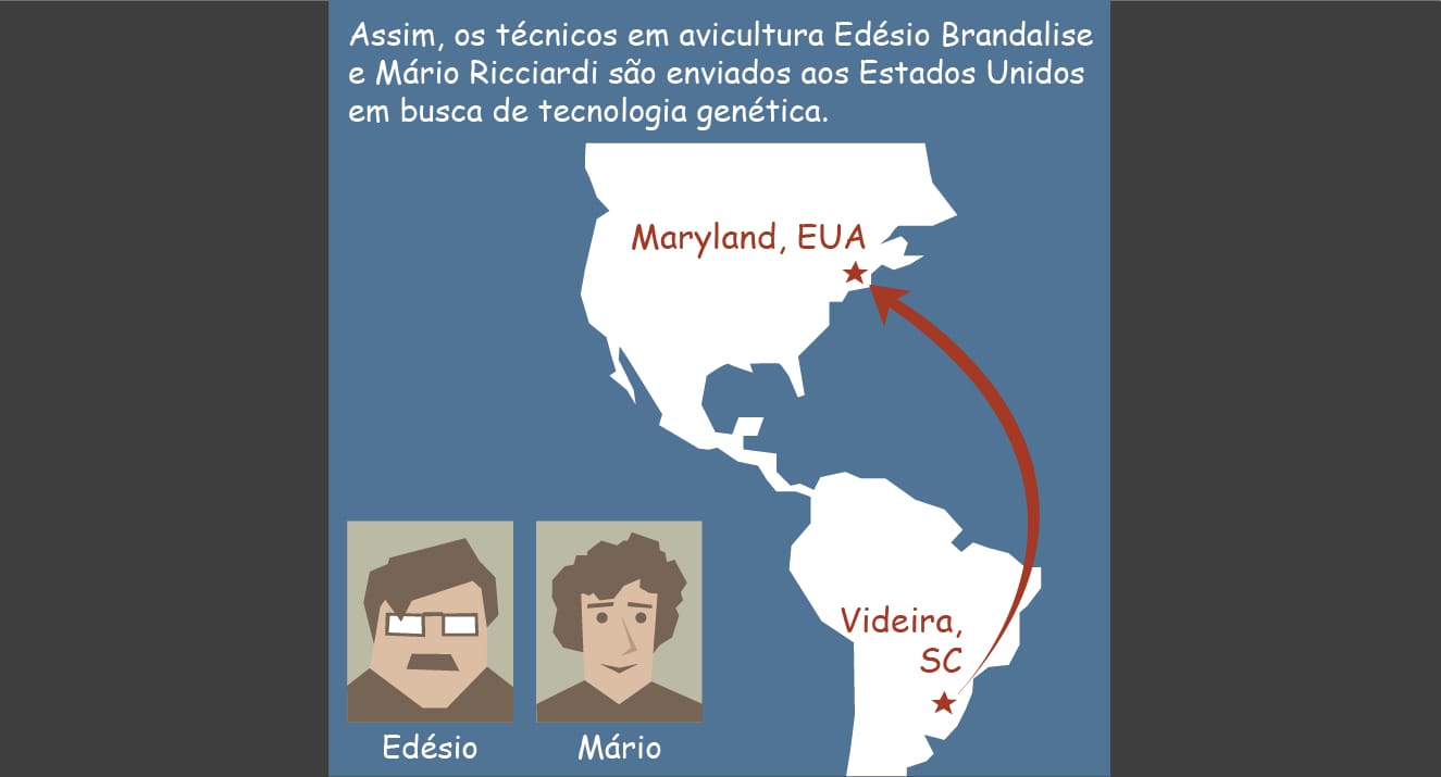 Em Maryland, o diretor do setor de agropecuária Edésio Brandalise e o veterinário Mário Ricciardi encontraram um geneticista que havia produzido uma linhagem de frangos com desenvolvimento muscular no peito e coxas. Entre 3 mil e 5,5 mil ovos foram importados ao Brasil.