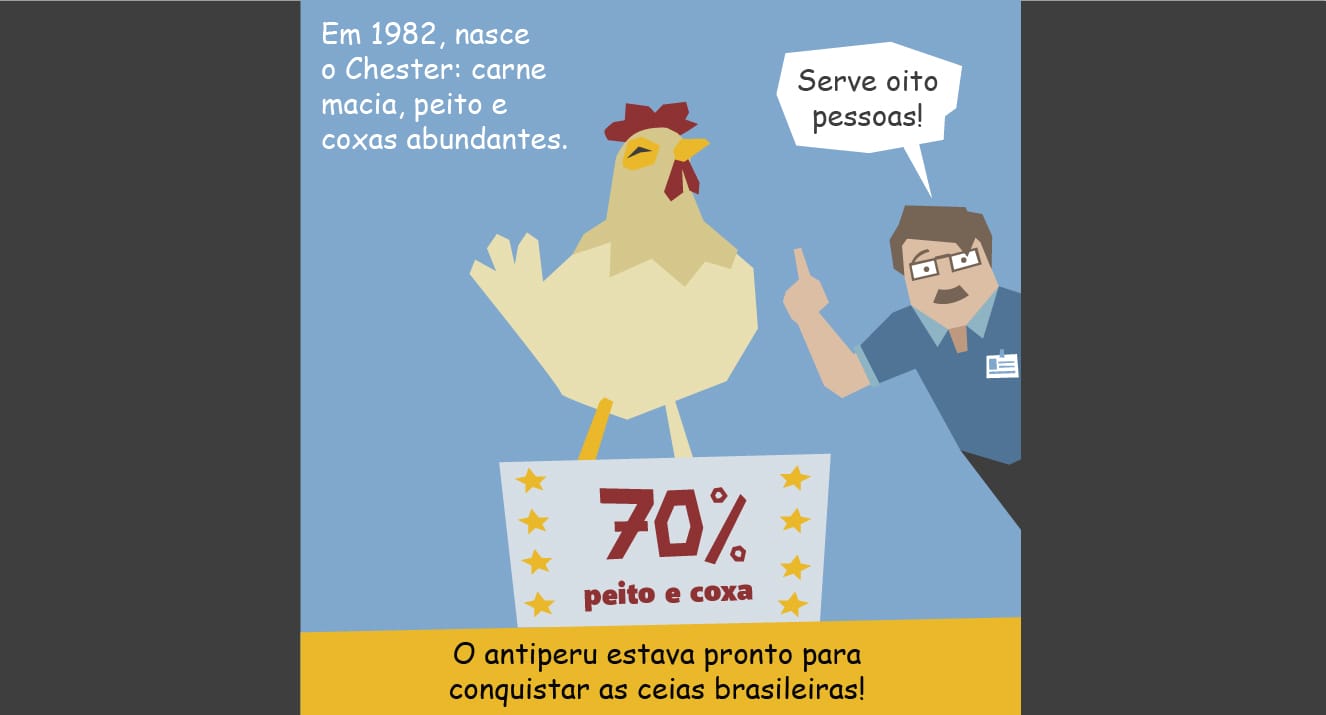 A história do Chester começou em 1979, quando a direção da Perdigão enviou dois técnicos até os Estados Unidos com a missão de encontrar uma alternativa ao peru.
