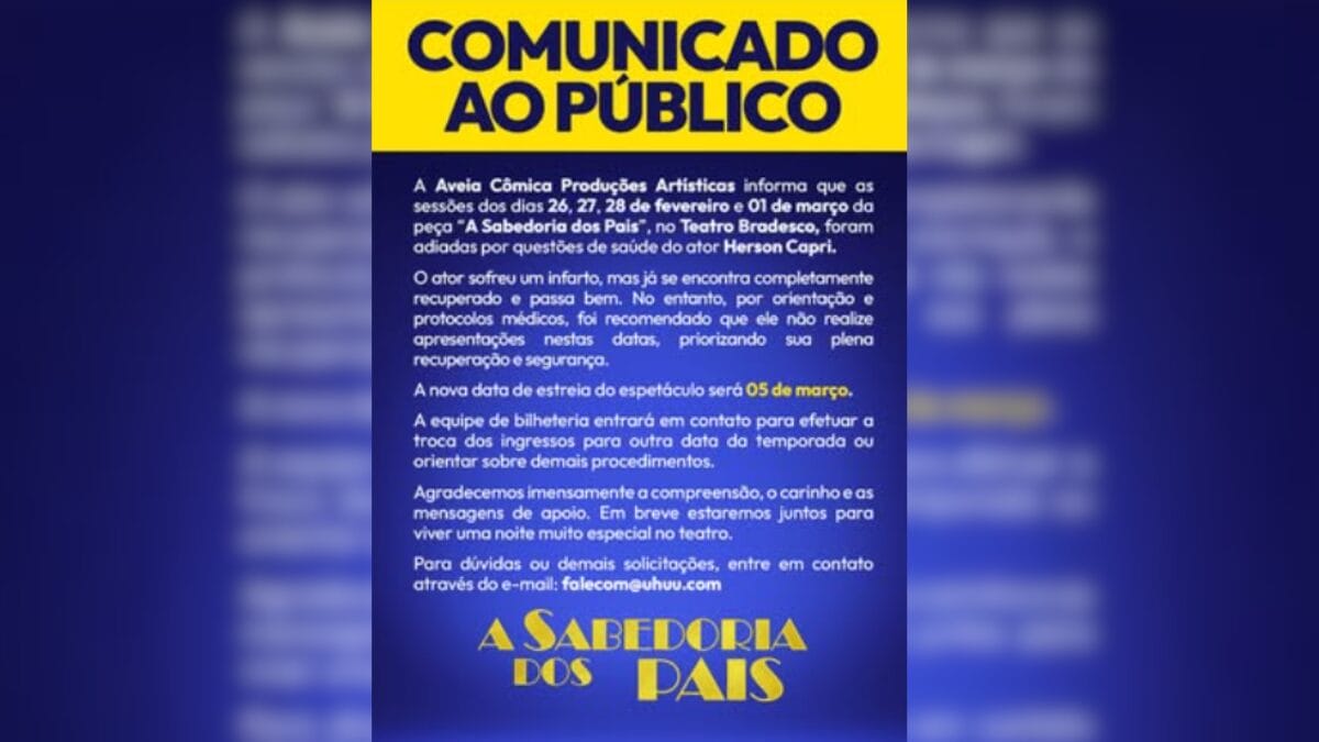 Por conta do estado de saúde do ator, a estreia da peça “A Sabedoria dos Pais” em São Paulo, prevista para o dia 26 no Teatro Bradesco, foi adiada para o dia 5 de março. Isso porque, segundo a equipe do ator, Herson precisa evitar atividades físicas e esforço nas próximas semanas. No entanto, ele já está bem, de acordo com a assessoria.