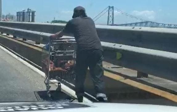 Um homem foi flagrado andando com um carrinho de compras — com seu cachorro e algumas latinhas de reciclagem dentro — na travessia de carros da ponte Colombo Salles, em Florianópolis. Um vídeo flagrou a cena inusitada, que aconteceu por volta do meio-dia desta quinta-feira (20). A Guarda Municipal parou o individuo, que contou que estava a caminho do Paraná com Pitoco, o cachorro.
