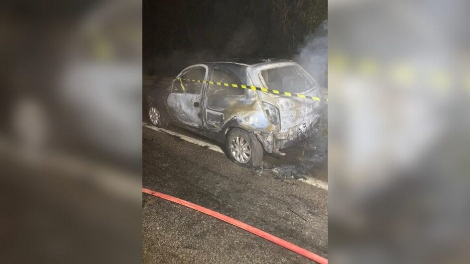 Ao chegarem ao local, os bombeiros confirmaram que um Chevrolet Celta estava completamente tomado pelas chamas, sem vítimas no interior.