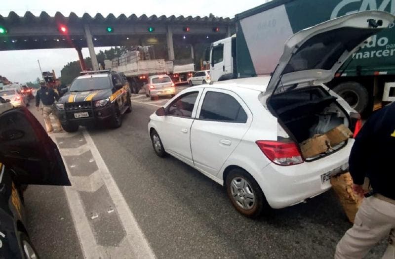 Segundo a PRF, os policiais realizaram a abordagem de um GM Onix, com placas de São José. Durante a fiscalização do veículo na praça de pedágio, os agentes encontraram os tabletes de maconha no porta-malas.