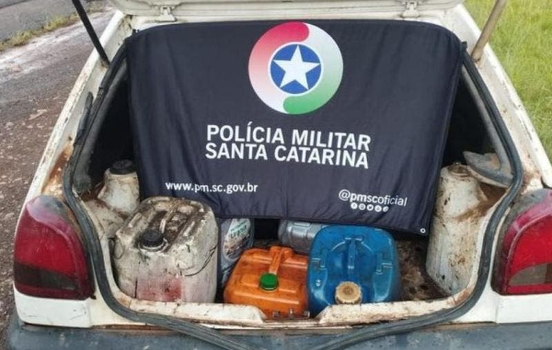 O veículo foi abordado por uma guarnição após tentar fugir de uma barreira policial na BR-163, interno do município catarinense. Os galões estavam no porta-malas do veículo.