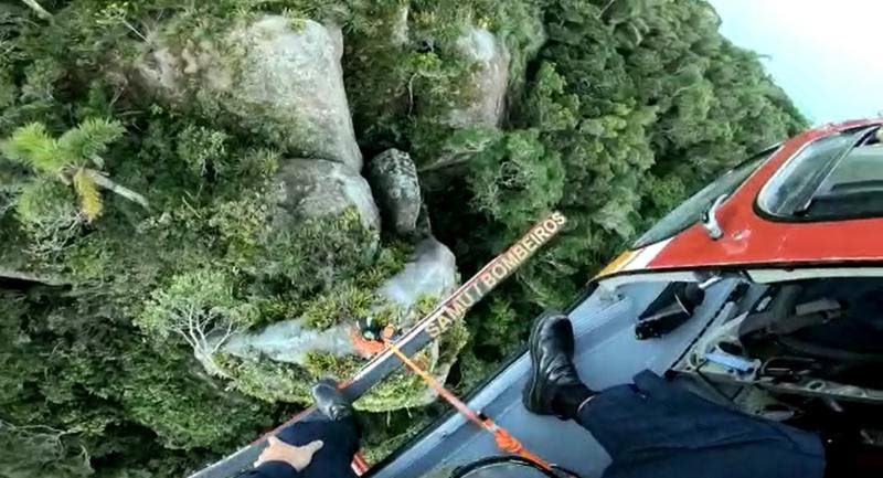 Num primeiro momento foi feito um rapel para o resgate. Depois o grupo de bombeiros realizou o içamento do jovem para levar ele até a faixa de areia da praia.
