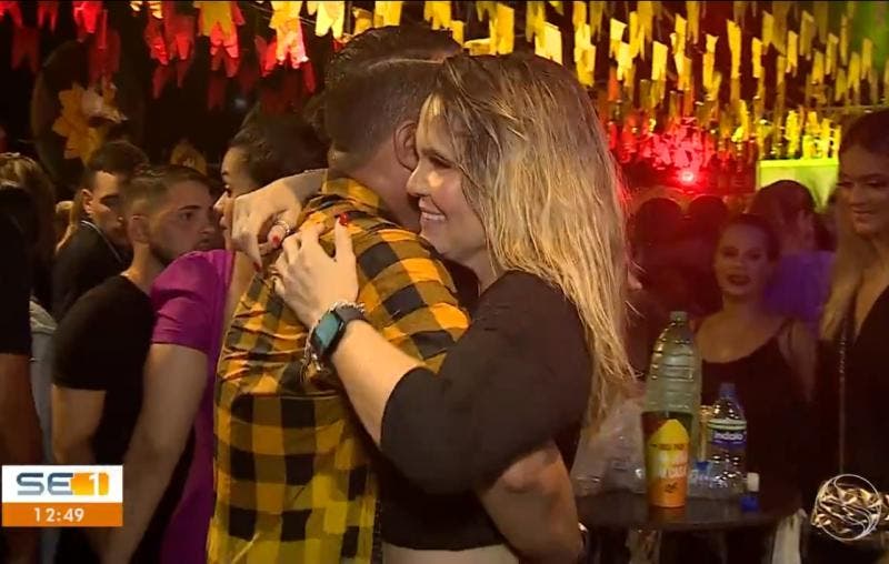 Diante das câmeras, a empresária Isabela Salin comenta com a repórter as emoções vividas em meio ao São João. Enquanto ela discursa na festa junina, o homem, usando camisa xadrez amarela, nem “dá as caras”.