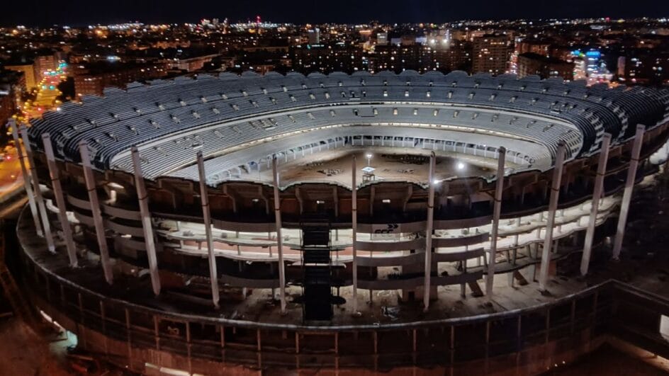Imagens aéreas inéditas mostram o maior estádio fantasma do mundo de uma forma pouco vista nos últimos anos. O Nou Mestalla, futura casa do Valencia, da Espanha, aparece iluminado durante a noite.