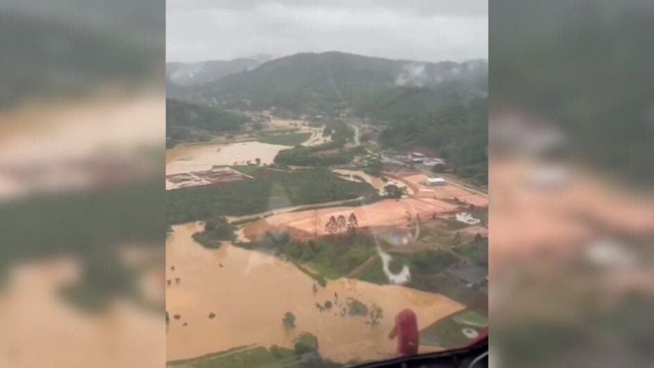 Imagens áreas feitas pelo Corpo de Bombeiros Militar mostram a proporção dos alagamentos em Luiz Alves na tarde desta segunda-feira (24). A cidade registrou quase 200 milímetros de chuva nas últimas 24 horas. A maior parte se concentrou entre o meio-dia e 15h.