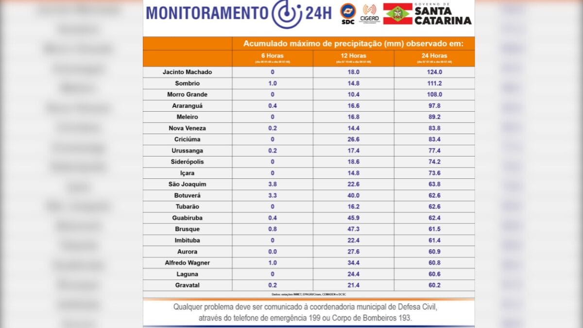 Em Urussanga, no Sul de Santa Catarina, as chuvas intensas provocaram obstrução de drenagem em loteamento, com deslizamentos registrados nos bairros Santana e Linha Rio Maior. Nenhuma casa foi afetada e não há registros de desabrigados.