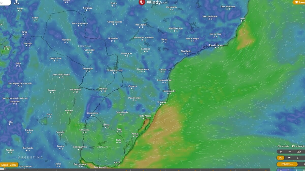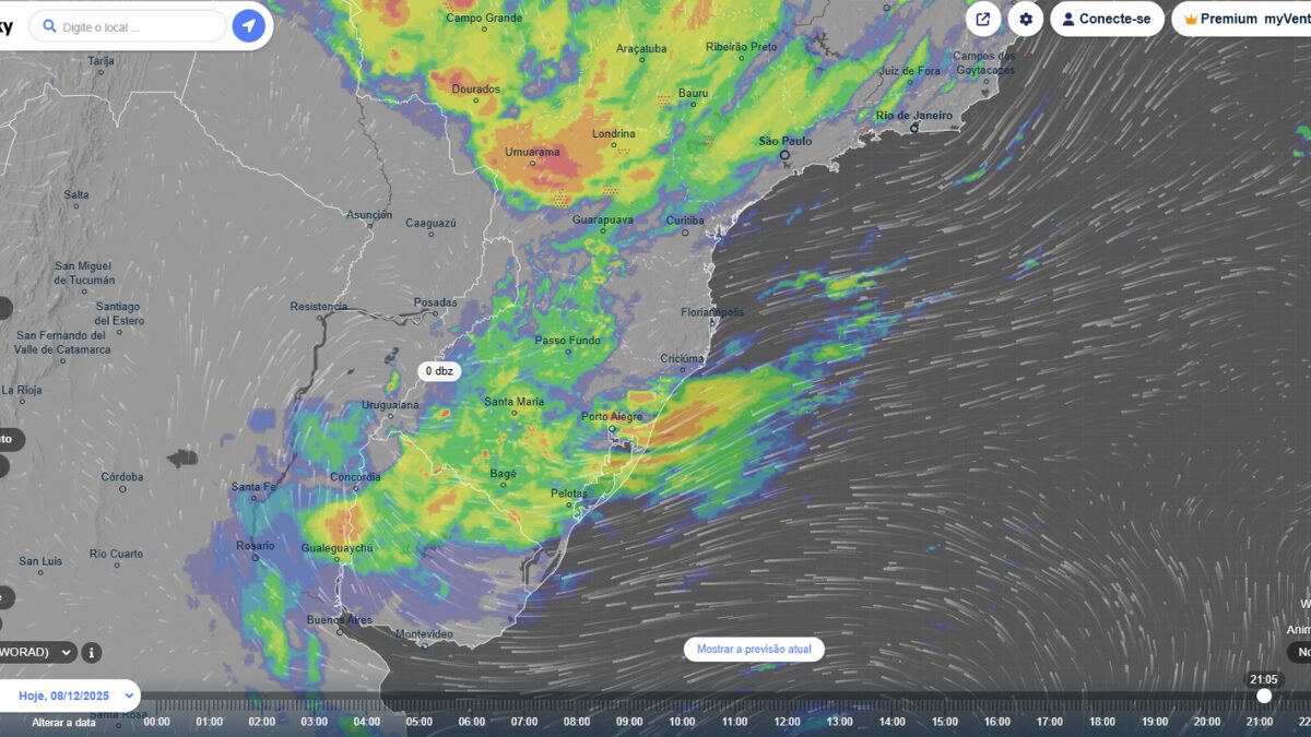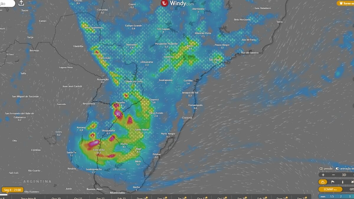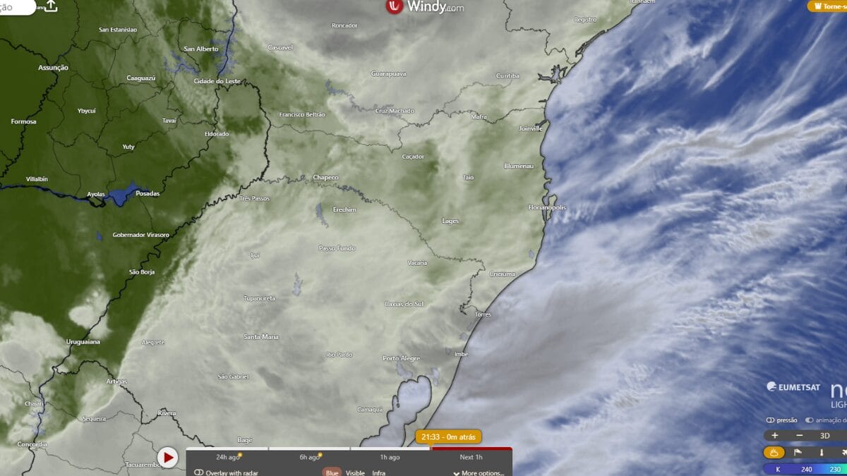 Imagens geradas através de ferramentas de previsão de tempo mostram a formação do ciclone extratropical que se aproxima de Santa Catarina entre essa segunda (8) e terça-feira (9). As imagens de satélite e modelos feitos através de radares meteorológicos mostram a instabilidade sobre o Rio Grande do Sul na noite desta segunda, e a previsão para as próximas horas, em que a chuva deve avançar em direção ao Estado.