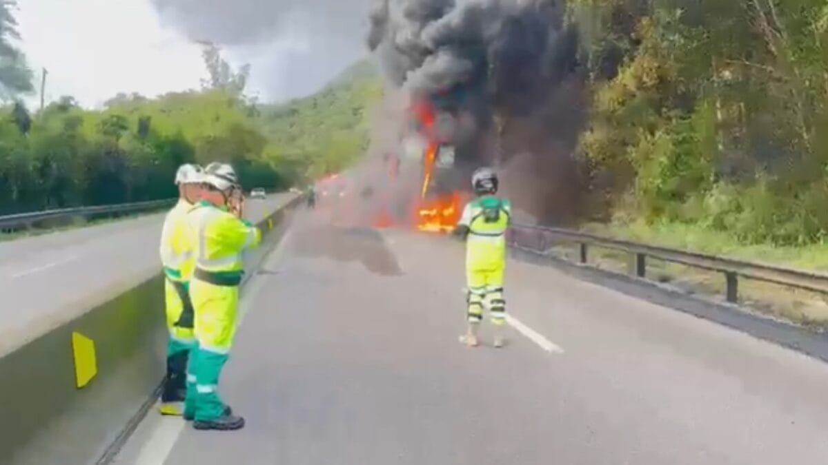 Um vídeo mostra uma coluna de fumaça proveniente de um incêndio em um caminhão na BR-101 no Morro dos Cavalos, em Palhoça, na Grande Florianópolis, na tarde desta segunda-feira (5). As imagens foram divulgadas pela Polícia Rodoviária Federal e mostram o combate às chamas, que deixaram o veículo completamente destruído.