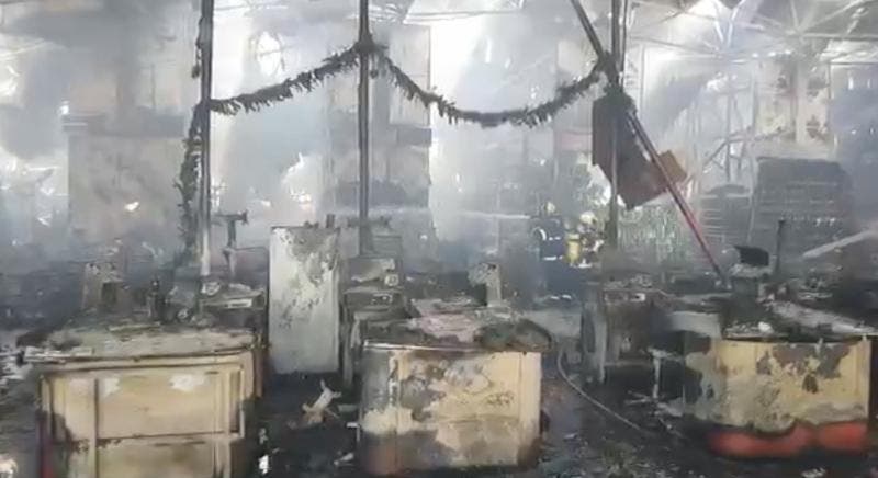 Nas imagens é possível ver os caixas, na entrada do supermercado, cobertos pelas cinzas. Ao fundo, as prateleiras onde ficam as mercadorias aparecem completamente destruídas.