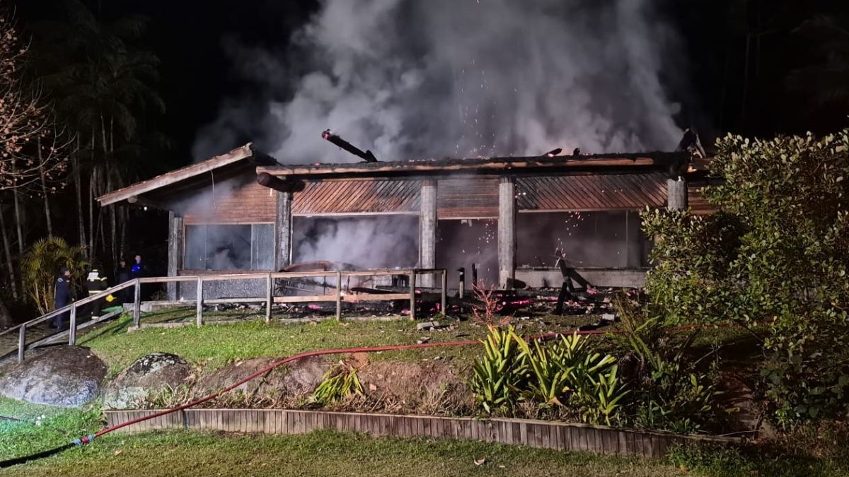Um grupo de mulheres levou um susto e precisou pensar rápido ao se deparar com um incêndio durante um retiro religioso. O fogo destruiu uma casa localizada no bairro Santa Catarina, no interior de Biguaçu, na Grande Florianópolis, durante a noite de sábado (19).