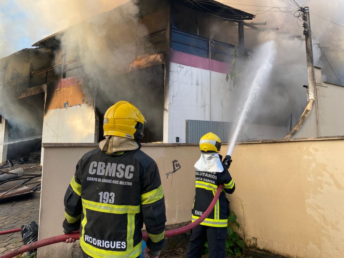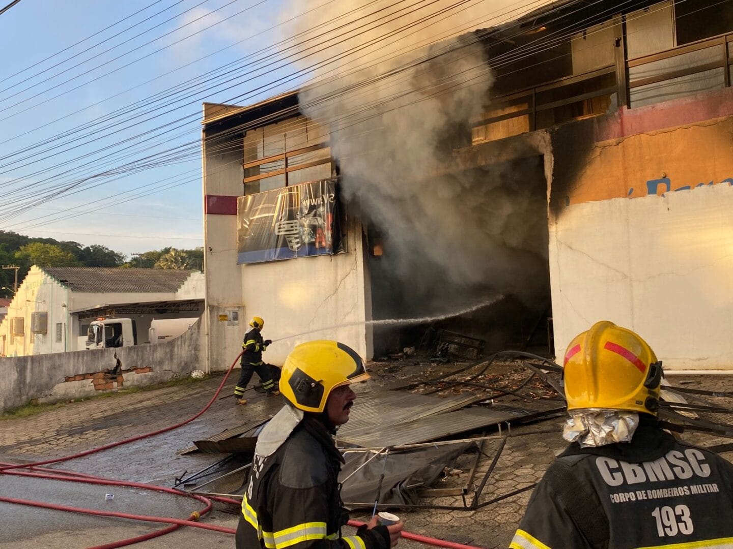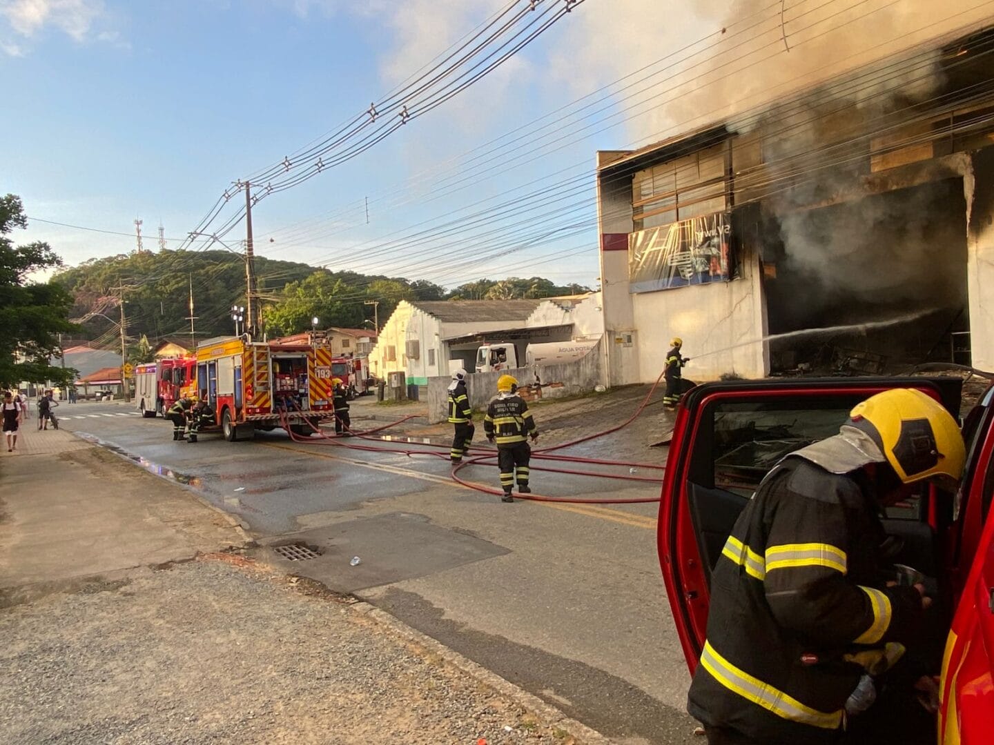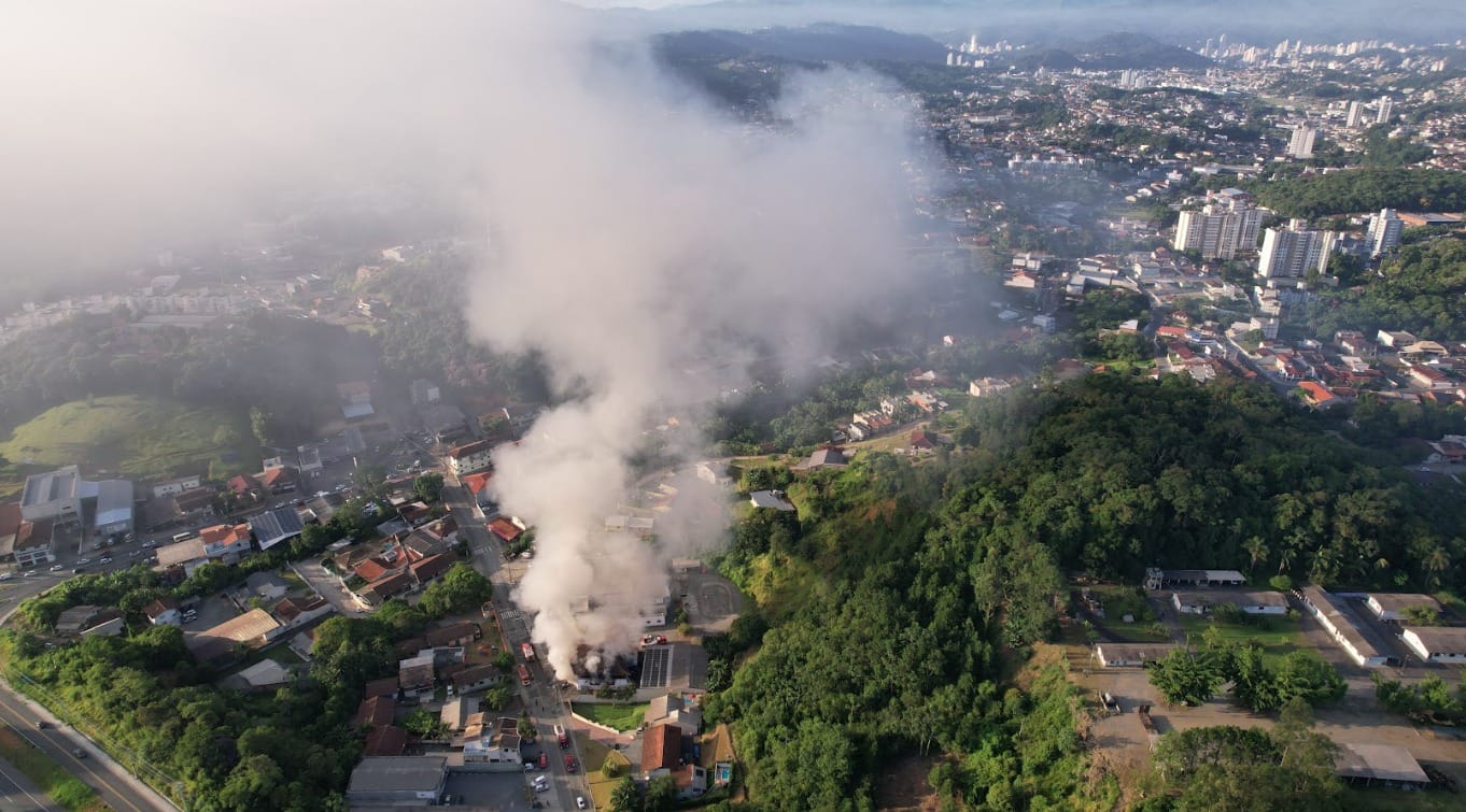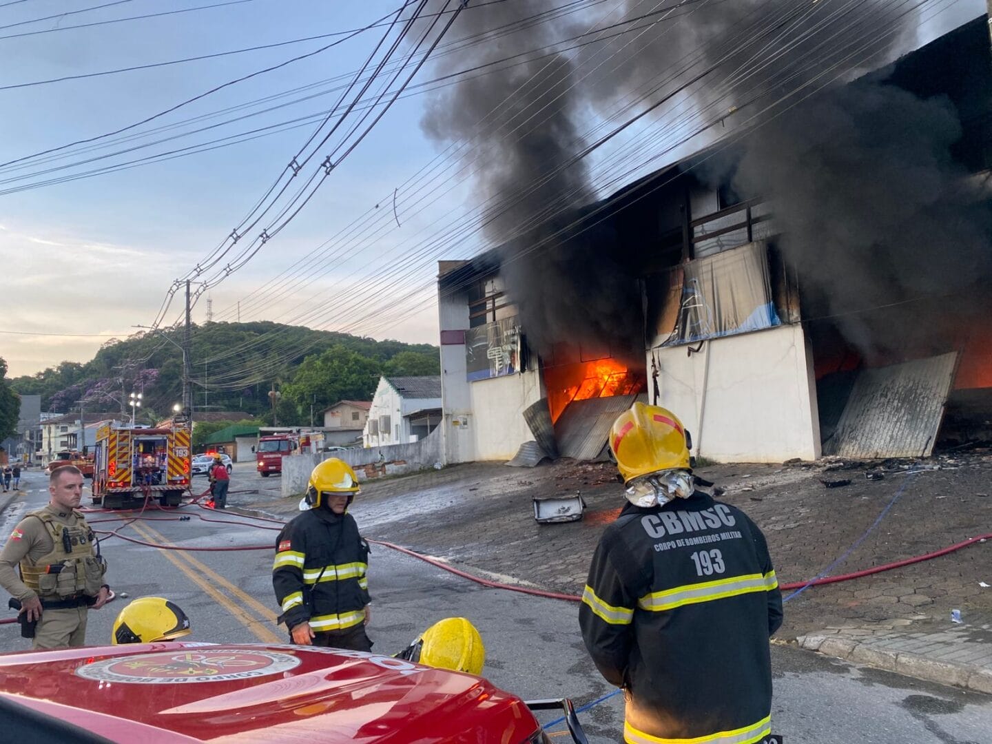 Bombeiros trabalham nesta sexta-feira (6) para controlar um incêndio em uma loja de faróis em Blumenau. O fogo começou um pouco antes das 5h e mobiliza equipes não apenas da cidade, mas também de Timbó e Gaspar, que foram chamadas para ajudar com caminhões autotanque.