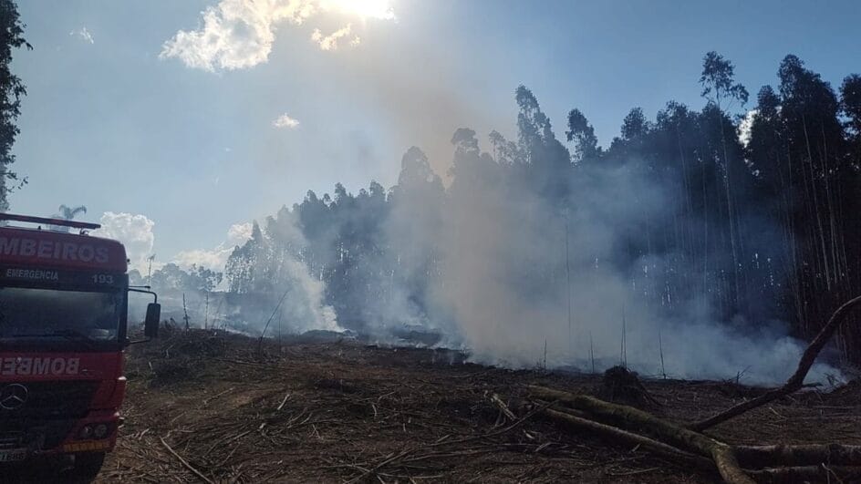 Era por volta de meio-dia quando os bombeiros militares foram acionados para apagar as chamas que atingiam uma floresta na localidade de São João dos Cavalheiros.
