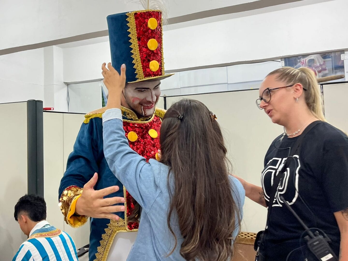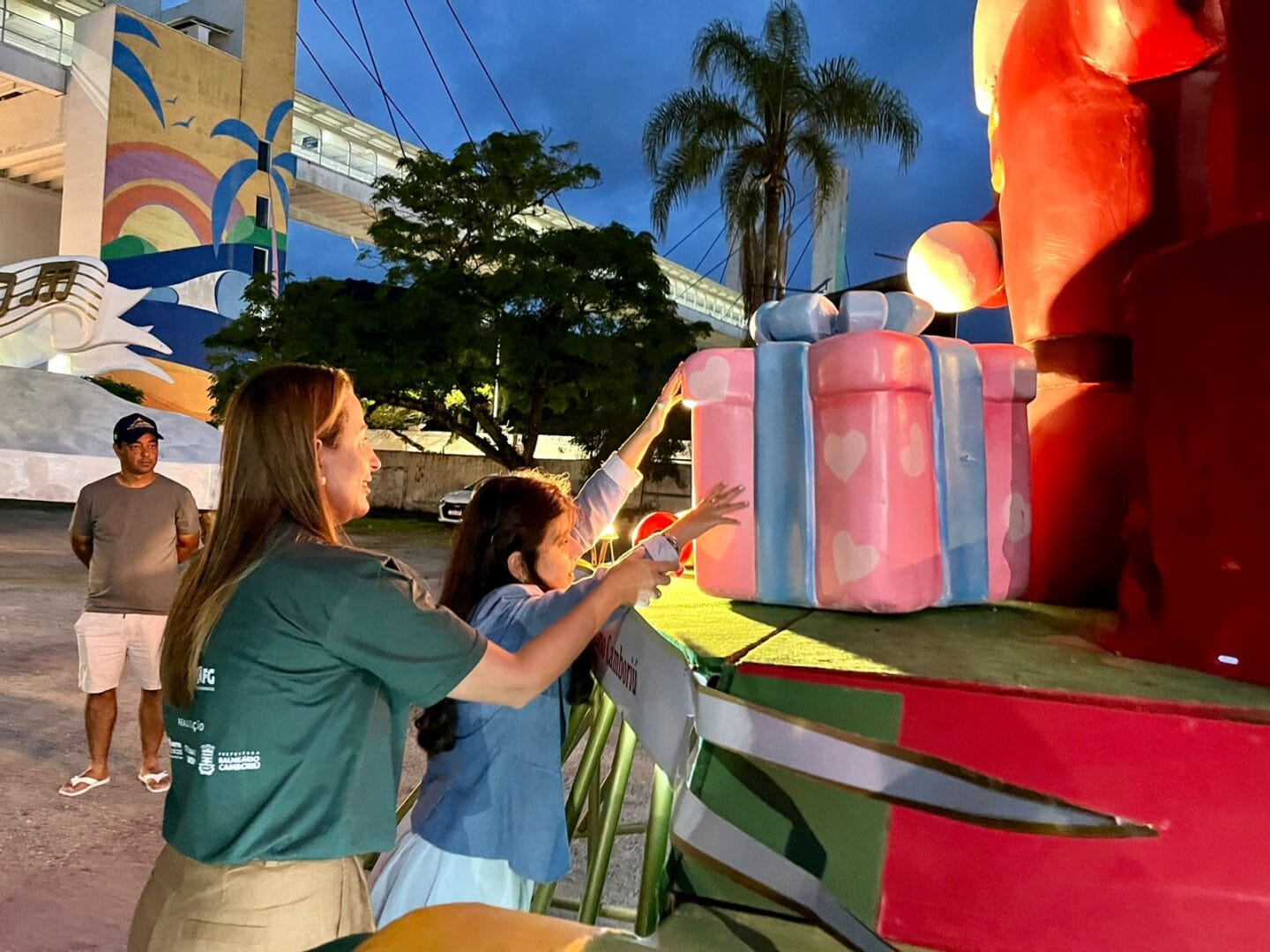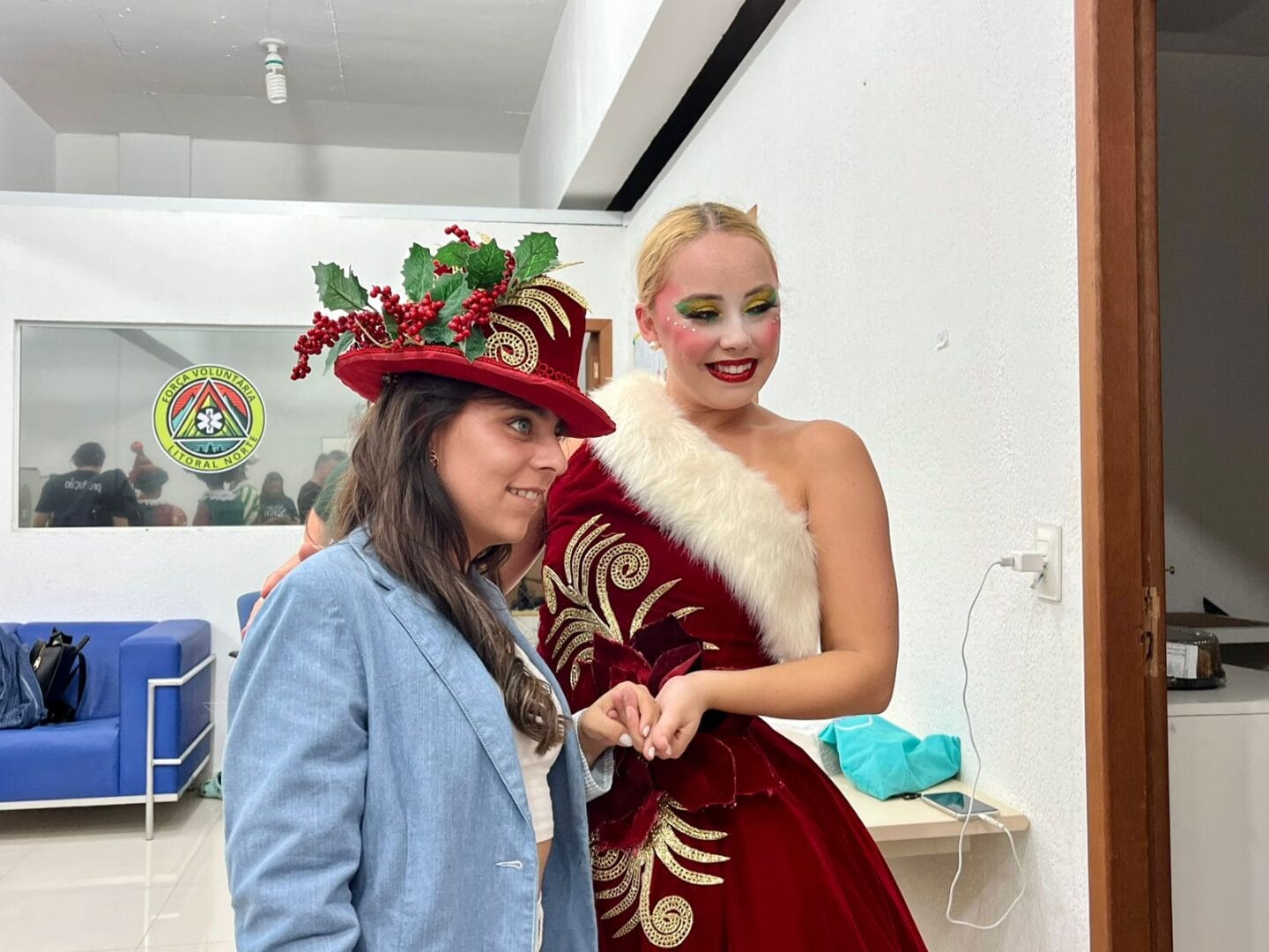 Uma jovem com deficiência visual pode vivenciar o Natal de Balneário Camboriú através do toque. Mariana Candido, de 22 anos, esteve nos bastidores do desfile que percorre a orla da Praia Central e foi levada para conhecer o elenco e sentir nas pontas dos dedos os figurinos usados por cada um deles.