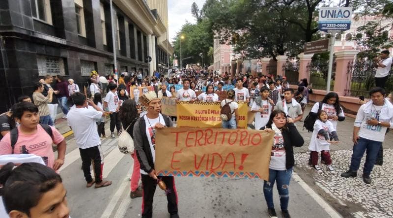 Indígenas de Santa Catarina realizam um ato pelas ruas do Centro de Florianópolis. Eles se juntam a uma manifestação que ocorre em todo o país contra o Marco Temporal. Também pedem justiça por Bruno e Dom e a saída do presidente da Funai Marcelo Xavier. Estão presentes Xokleng, Guarani e Kaingang. A concentração foi no Largo da Alfândega e a caminhada segue até o prédio da Justiça Federal.
