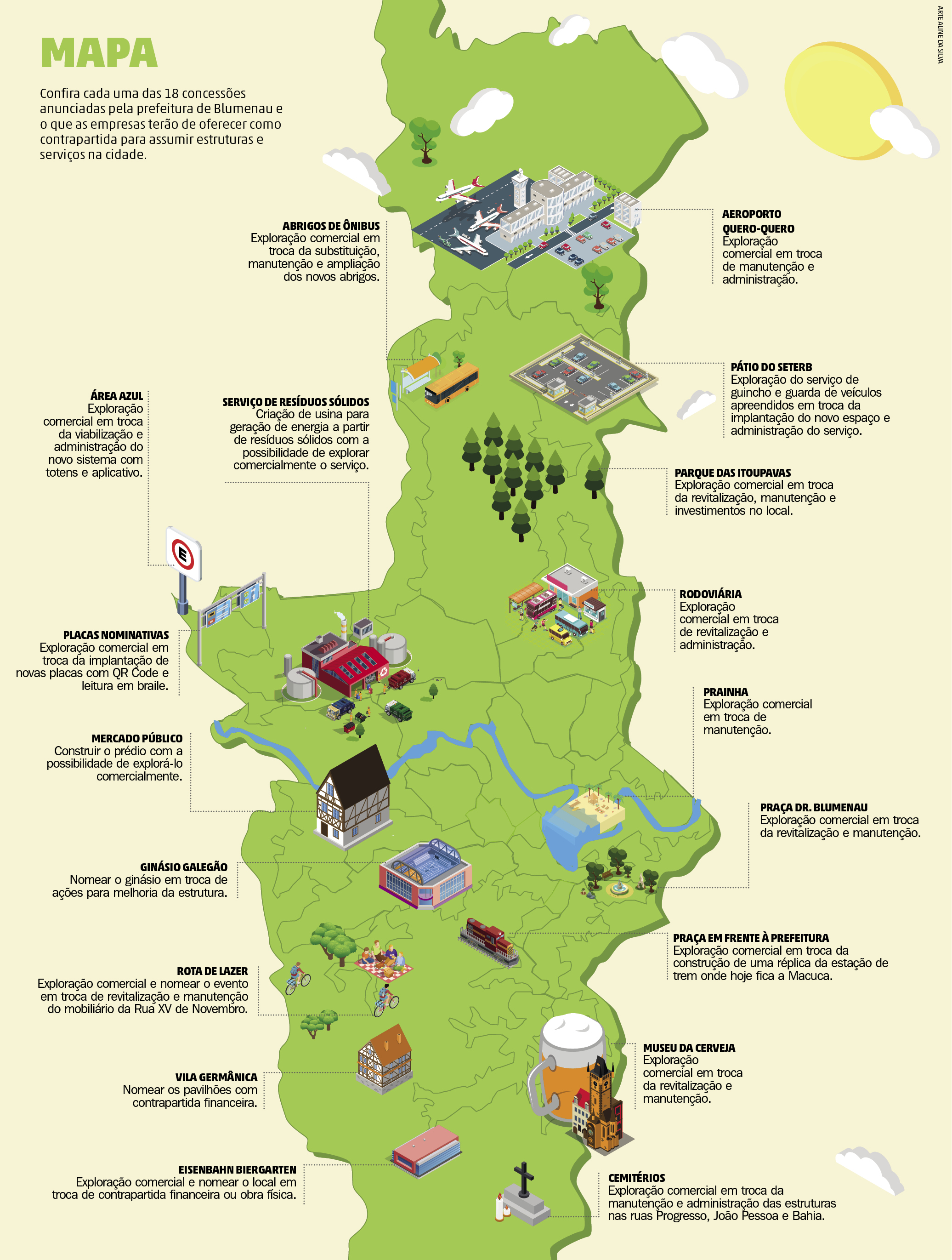 Na última quinta-feira a prefeitura de Blumenau anunciou a concessão de 18 estruturas e serviços no município. A estimativa do Executivo é de que a cidade receba investimentos de R$ 250 milhões. Confira abaixo cada uma delas e quais serão as contrapartidas que a iniciativa terá de oferecer: