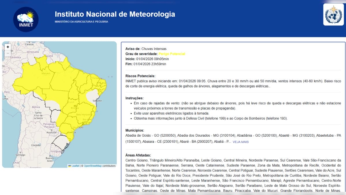 O Instituto Nacional de Meteorologia (Inmet) publicou nesta quarta-feira (1º) um alerta laranja, de “perigo”, para chuvas intensas em 18 unidades da federação nas regiões Sudeste, Centro-Oeste, Norte e Nordeste. Outras regiões, incluindo Santa Catarina, estão sob aviso amarelo, de “perigo potencial”.