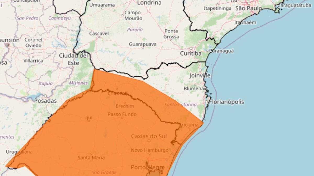 O Instituto Nacional de Meteorologia (Inmet) emitiu um alerta laranja de “perigo” para chuvas intensas em Santa Catarina nesta quinta-feira (19). O aviso, válido até sexta-feira (20), inclui as regiões Sul, Oeste e Serra, além de parte do Rio Grande do Sul.
