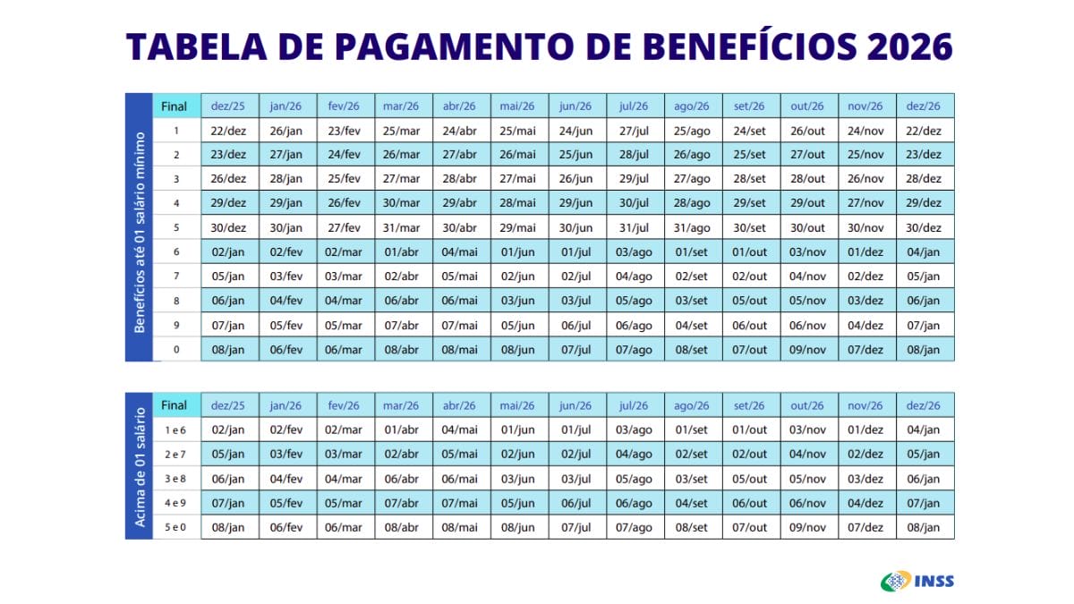 Para quem recebe até o salário mínimo, o calendário de janeiro começa com os benefícios de final 1, no dia 26 de janeiro. Para quem recebe acima desse valor, o cronograma inicia com os benefícios de finais 1 e 6, com pagamento em 2 de fevereiro.