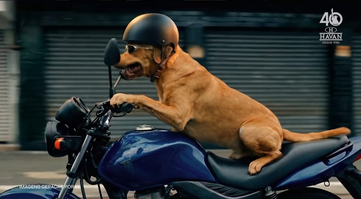 As primeiras peças publicitárias trazem um cachorro caramelo pilotando uma moto com uma vovó na garupa pelas estradas. Na outra, um gato sedutor aparece fazendo comida (veja galeria de imagens abaixo). E, claro, sempre trazendo produtos em oferta nas lojas da rede pelo Brasil. Uma frase aparece na parte inferior da tela informando ser material gerado por Inteligência Artificial.