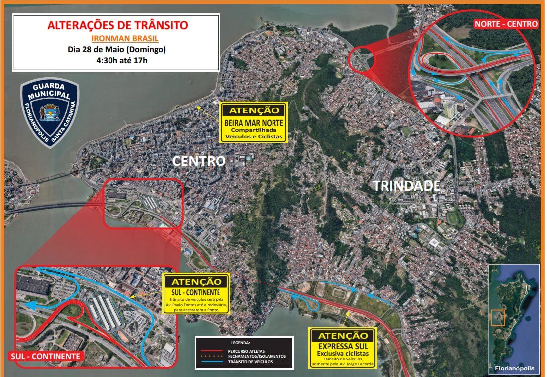 Por conta do alto número de participantes previsto, ocorrerão alterações de trânsito em pontos da cidade entre 4h30min e 17h. A Guarda Municipal de Florianópolis (GMF) e Polícia Rodoviária Estadual (PRE) estarão na ativa.