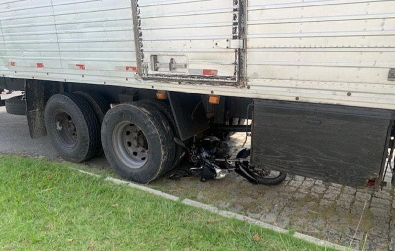Segundo a Polícia Rodoviária Federal (PRF), houve uma colisão lateral entre a moto Honda/CG, com placas de Balneário Piçarras, e um caminhão Mercedes Benz, de Uberaba (MG). A motocicleta foi parar embaixo do veículo.