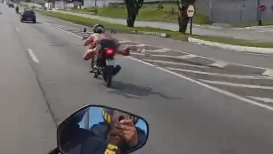 As imagens feitas pelos agentes mostram o motociclista transitando deitado sobre o banco, se segurando apenas pelo guidão, fazendo a manobra conhecida como “Superman” (assista ao vídeo abaixo).