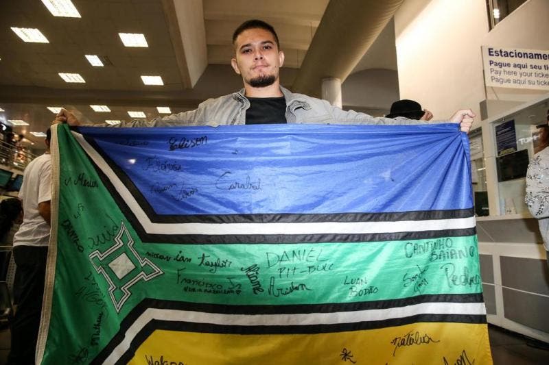 Entre as centenas de pessoas que foram ao aeroporto de Florianópolis receber com festa o deputado federal Jair Bolsonaro (PSC-RJ) na manhã desta quinta-feira, um chamava mais atenção por estar enrolado em uma bandeira do estado do Amapá. Tratava-se do jovem treinador de jiu-jitsu Aron Mirlo, de 23 anos. Ele veio de Macapá para Santa Catarina ainda na semana passada somente para acompanhar o tour de eventos e palestras do parlamentar, que ocorre até amanhã.