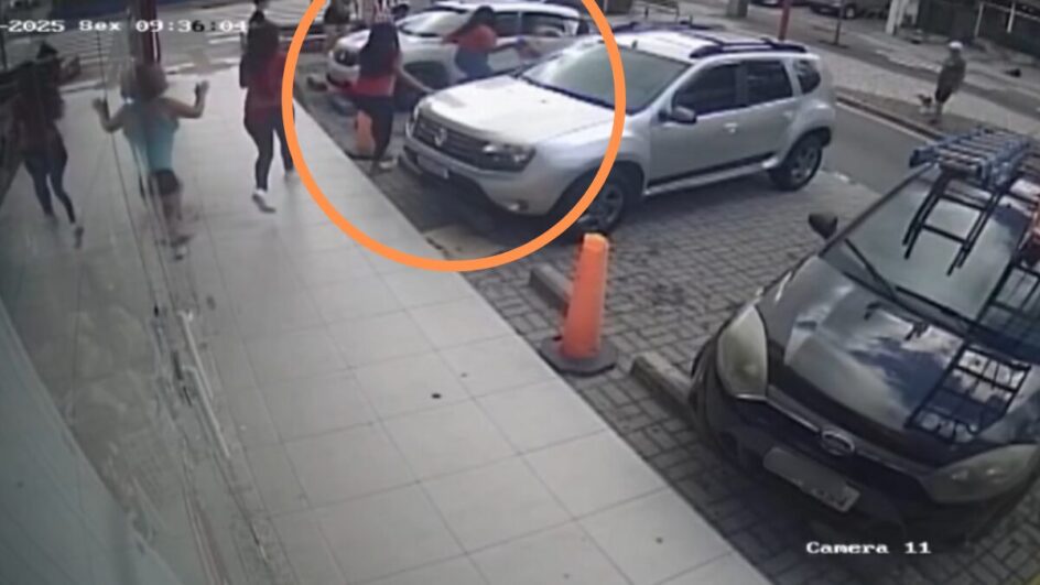 Um vídeo retrata o momento em que a mulher sai do carro e o criminoso foge. As imagens mostram pessoas tentando conter o ladrão, mas mesmo assim ele arranca com o carro e deixa o local.