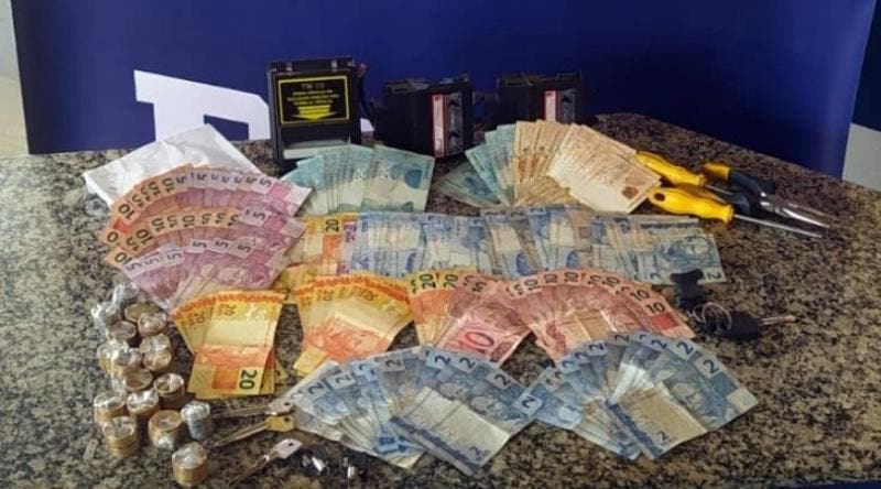 Dentro do carro, os policiais flagraram quatro pessoas (dois homens e duas mulheres). Eles estavam carregando R$ 2.919,00 em notas e moedas diversas, e ainda chaves e ferramentas usadas para abrir as máquinas de bicho de pelúcia.