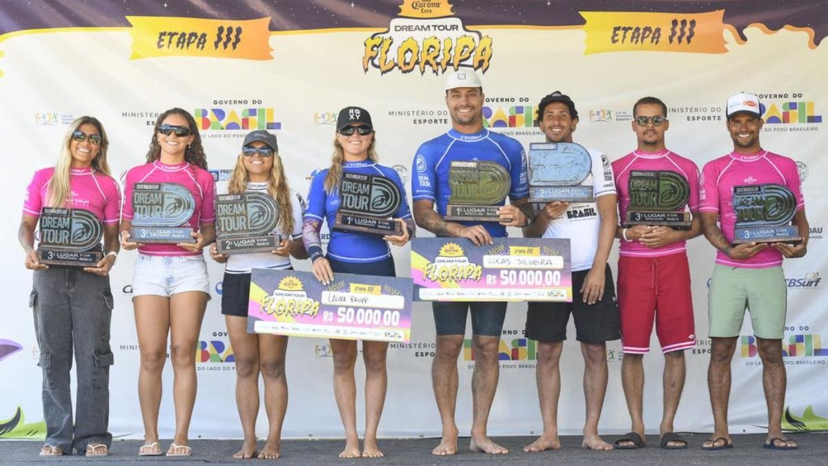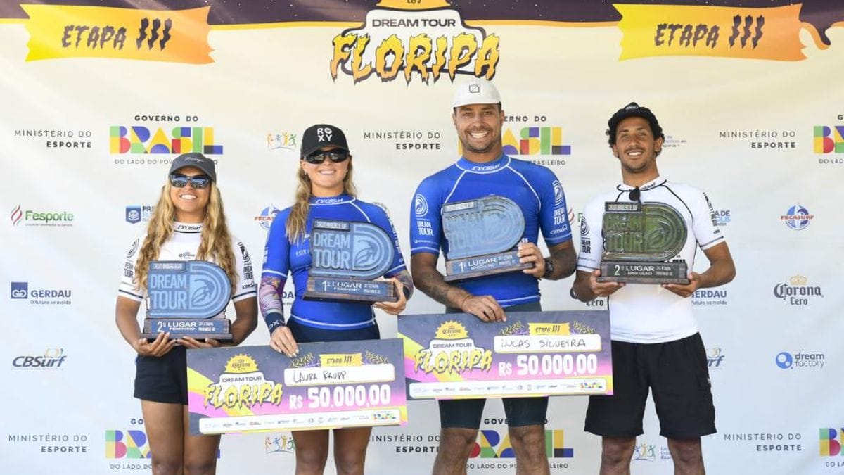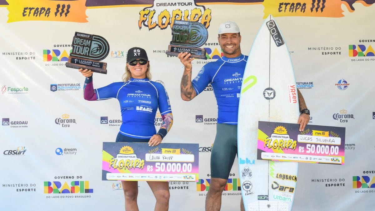 Os “manezinhos” Laura Raupp e Lucas Silveira se consagraram campeões da terceira etapa do Dream Tour, nesta segunda-feira (10), na Praia Mole, em Florianópolis.