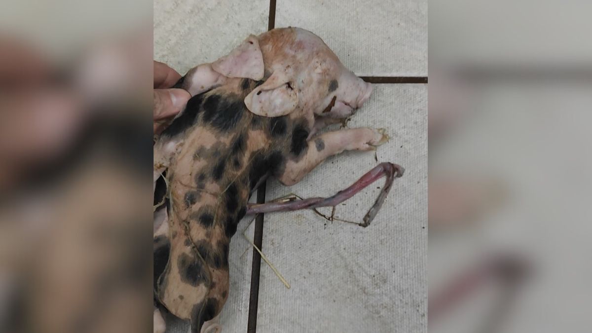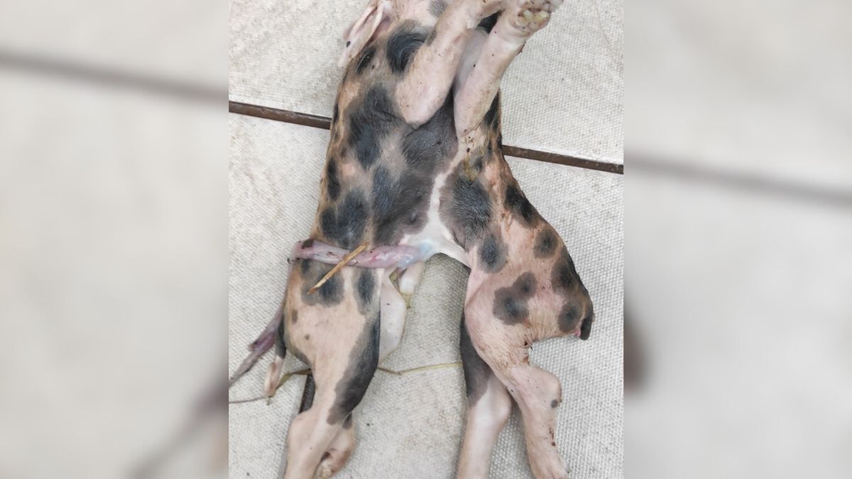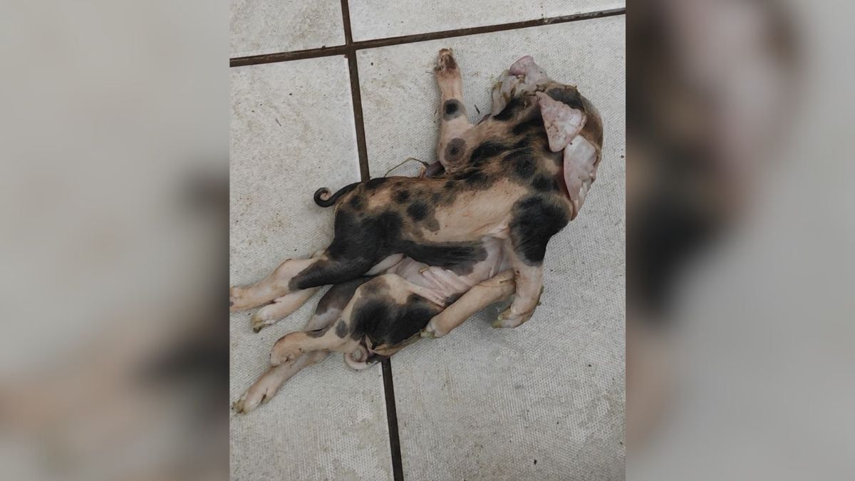 O animal fazia parte de uma ninhada de sete filhotes, mas nasceu já sem vida. A cena despertou curiosidade entre familiares e vizinhos, que nunca haviam presenciado algo semelhante.