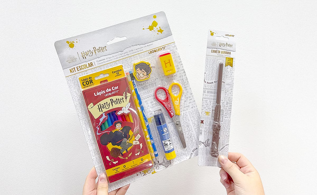 A linha inspirada no universo Harry Potter é uma das grandes apostas do ano, e inclui caderno fichário universitário de 1 matéria com 96 folhas, de R$ 44,10 por R$ 34,90, kit de lápis de cor com 12 cores, de R$ 54,00 por R$ 34,90, e caneta esferográfica em formato de varinha, de R$ 69,30 por R$ 34,90.