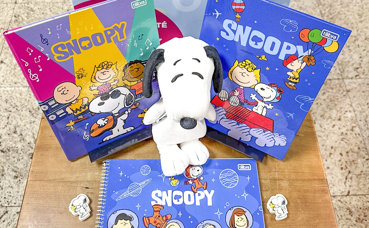 O Snoopy retorna como um dos personagens mais procurados em 2026, com opções como caderno brochurão com 80 folhas, de R$ 60,00 por R$ 34,90, caderno de cartografia espiral, de R$ 60,80 por R$ 36,90, e borracha temática, de R$ 5,50 por R$ 3,90. Os personagens Tico e Teco também integram a linha de licenciados.