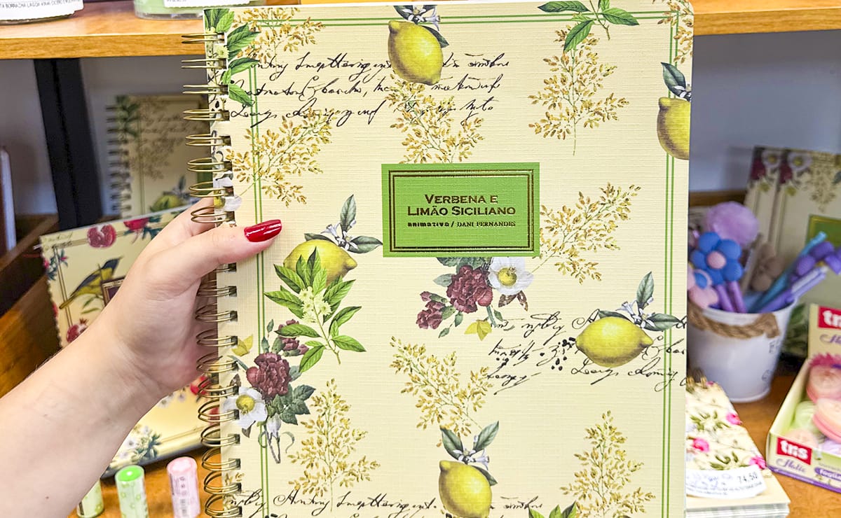Entre os lançamentos, os cadernos perfumados da designer Dani Fernandes aparecem como aposta para 2026, com fragrâncias como verbena e limão e flor de figo. O caderno universitário Verbena e Limão com 80 folhas passa de R$ 113,30 para R$ 79,00.