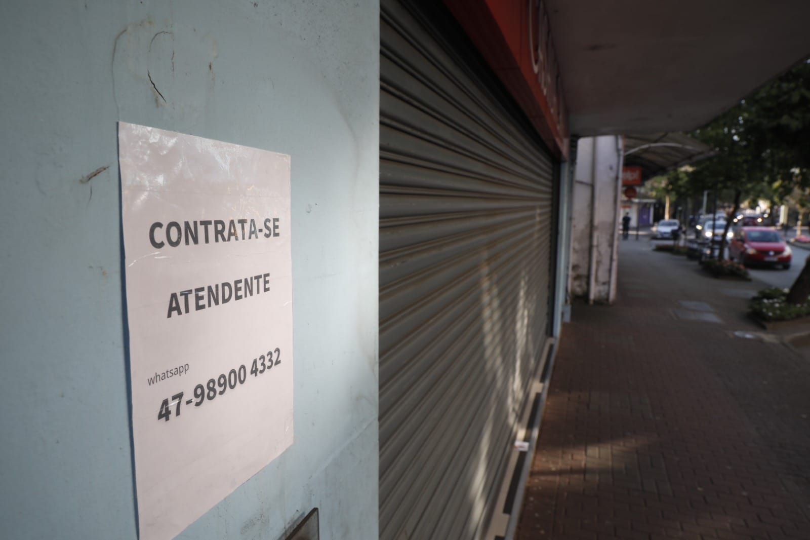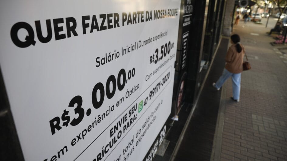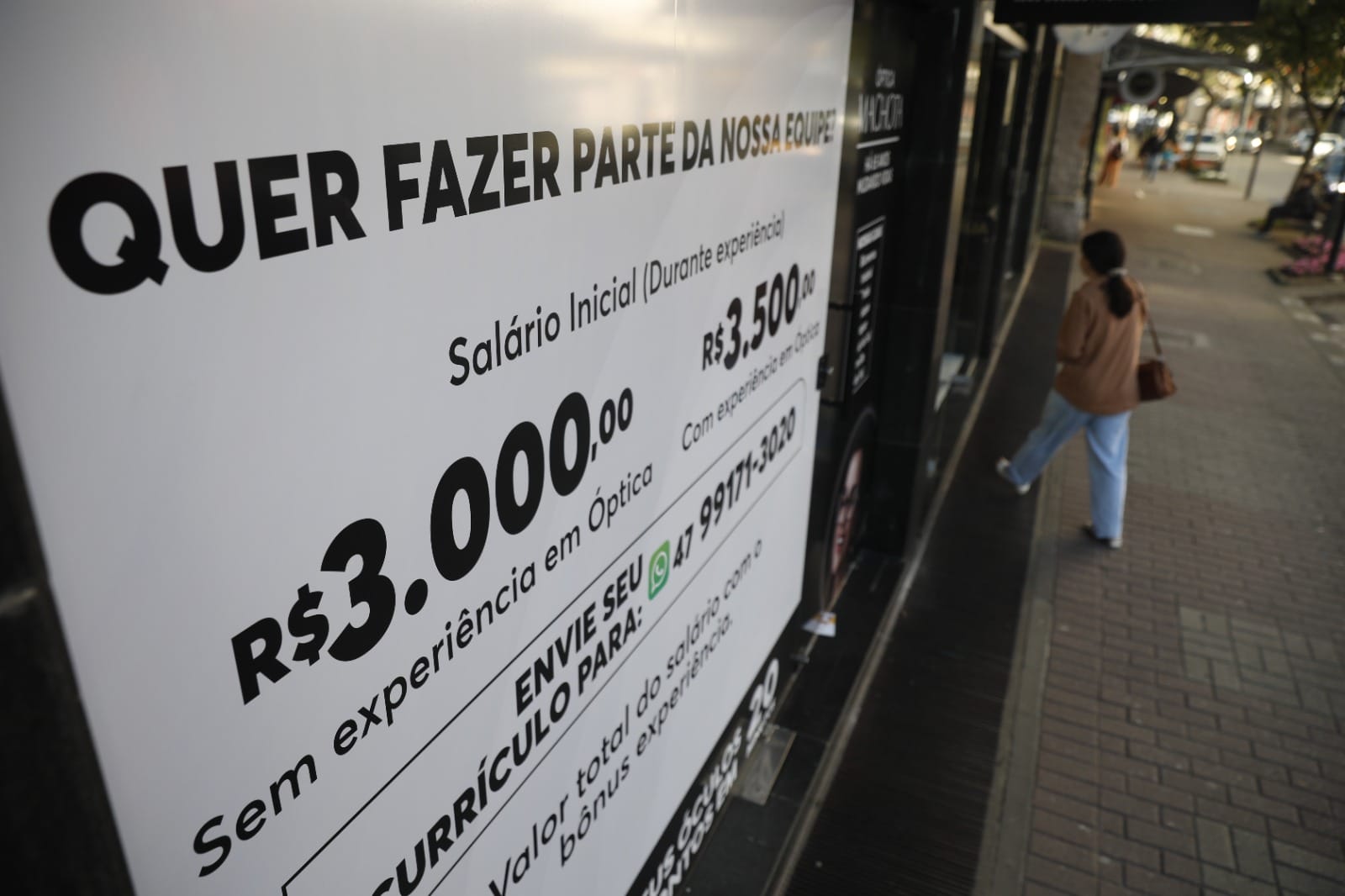 Na fachada do futuro empreendimento, nada de propaganda. O recado é claro e direto: estamos contratando e o salário é de R$ 3 mil para pessoas sem experiência e R$ 3,5 mil para quem tem experiência. Embaixo, um número de WhatsApp para envio de currículo.