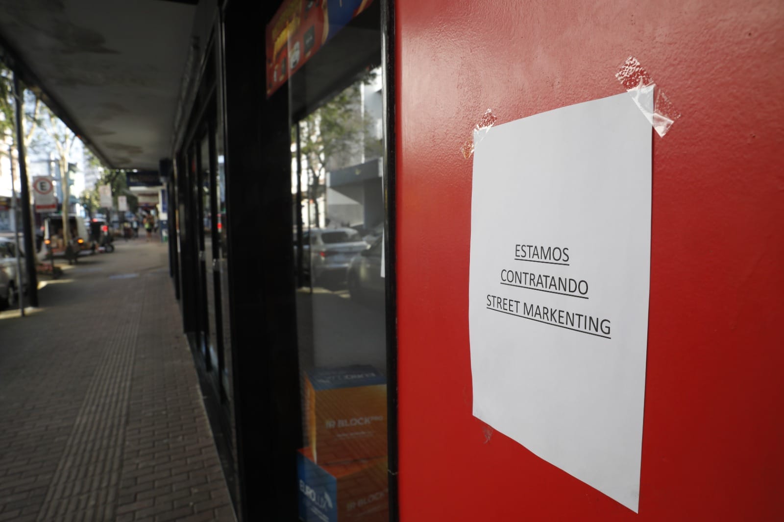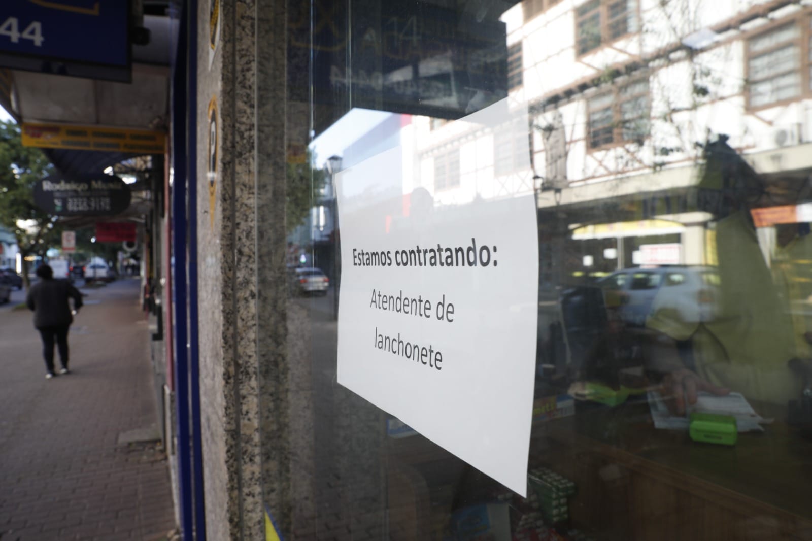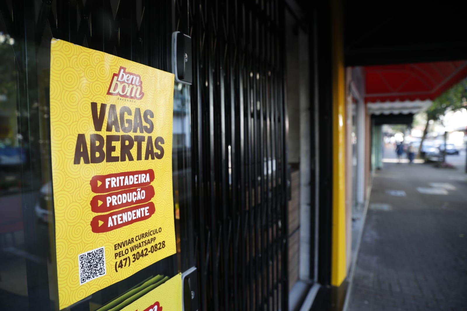 Na fachada do futuro empreendimento, nada de propaganda. O recado é claro e direto: estamos contratando e o salário é de R$ 3 mil para pessoas sem experiência e R$ 3,5 mil para quem tem experiência. Embaixo, um número de WhatsApp para envio de currículo.