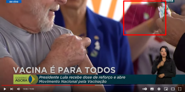 Na transmissão do evento feita pela TV Brasil, é possível acompanhar, a partir dos nove minutos e 37 segundos, Alckmin aplicando a substância em Lula. Imagens em zoom mostram o vice-presidente preparando a dose e, neste momento, quando ele retira um pouco do ar que há na seringa, nota-se alguns respingos saindo da agulha, comprovando que havia líquido no interior: