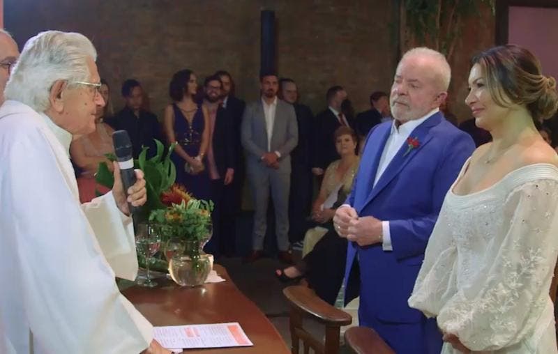 As imagens mostram a bênção do bispo que celebrou o enlace, dom Angélico Sândalo Bernardino, aos noivos, um discurso focado no amor familiar, mas também com um apelo social. O bispo emérito de Blumenau é um velho amigo do ex-presidente e já comandou a Pastoral Operária em São Paulo.