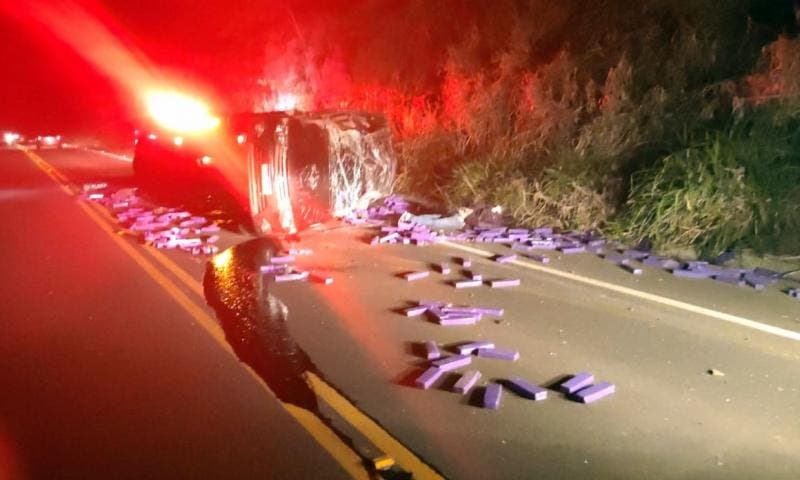 O porta-malas e o banco traseiro da picape estavam lotados com tabletes de maconha. A droga que ficou espalhada pela rodovia estadual foi recolhida pelas polícias.